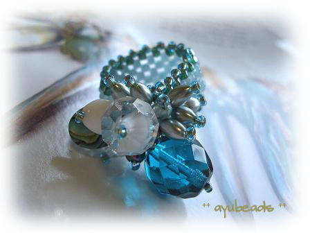 とても夏らしく鮮やかなブルーのリングです。ボリュームもあります。 チェコやビンテージ、シェルなどなど数種類のビーズを配しました。 このリングで「夏」を楽しんでください このリングはshopにてお買い求めいただけます。shopの入り口は↑こちら。 ←応援ポッチお願いします。