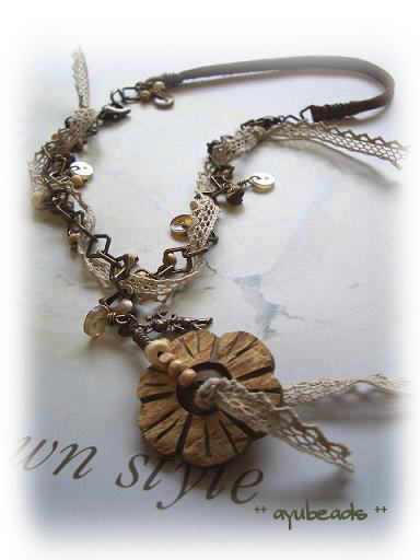 こちらは ウッドボタンをペンダントトップにして リボン、チェーン、レザーを使った ネックレスです。レーシーなリボンとチェーンの隙間から小さなウッドビーズとナチュラルカラーのボタンが顔をのぞかせていますvそしてこのネックレスのポイントはレザーの部分チェーン&リボンの部分ペンダントトップがそれぞれ取り外すことができるように なっています。 ペンダントトップなしのネックレス。2連のブレスレット(チャームありorなしで) 一連使いのブレスレット。 レザーのみでチャームをつけてもよしレース&チェーンだけでブレスにしても◎幾通りにも変身しちゃう??そんなネックレスにしました 秋にも活躍すると思います このネックレスはshopにてお買い求めいただけます。shopの入り口は↑こちら。 ←応援ポッチお願いします。