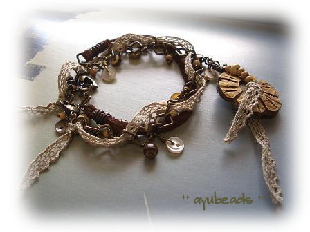 ダークブラウン、パープル、グリーンのウッドビーズに巻きつけたレースが可愛らしさをプラスしてくれています。その間にはカラフルなボタン達 秋色を意識してちょっとだけ遊び心のあるブレスレットですv このブレスレットはshopにてお買い求めいただけます。shopの入り口は↑こちら。 ←応援ポッチお願いします。