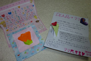 9日は母の日でしたね。ってもう1週間もたっちゃいましたが。毎年、母の日には、わたしの母、パパのお母さん、そしてパパのお父さんの姉、つまりパパの伯母さんにプレゼントを贈ってます。パパのお母さんと伯母さんは家も近く、本当の姉妹のように仲良し。そして、伯母さんには子どもがいないので、パパたち兄弟が子どものようなもの、今では、ミント(中1)やミルク(小3)が孫みたいなものでお世話になっています。最近、健康のため、パパのお母さんと伯母さんはスポーツクラブに通い始めたので、今年のプレゼントはこれからの季節によさそうなスポーツウェアにしました。二人ともとても喜んでくれました♪そして、わたしも母なわけですが、娘たちからお手紙とカード。折り紙のカーネーションつきです。実はまだ実母にあげてないっ!いっしょに買いに行くつもりにしていたのですが、わたしがなかなか時間がなくてっ・・ごめんなさーい!ランキングに参加しています☆応援よろしくお願いいたします。↓↓↓にほんブログ村