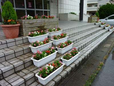 昨日は、2回目の花の植替えでした。→1回目の植替え場所は体育館前。プランター20個と丸い鉢2個です。プランターにはピンク、白、赤のベゴニア、丸い鉢には真ん中にゴールドクレストが植えてあるので、その周囲にマリーゴールドを植えました。そして、体育館目の両サイドに左右対称に置きました。横から見たところ。左サイドの前から見たところ。小雨が降っていましたが、渡り廊下で作業ができ、スムーズに植替え終了。植物の達人の地域の方Iさんに今回もお世話になりました。ベゴニアもマリーゴールドもほとんど手がかからないそうなので、安心♪ついでに、第1回目に植え替えた正門の花壇も写してきました。約1ヶ月でこんなに成長しました。・・と言っても植えた直後の写真がないので、分かんないですよね・・いちばん手前が紫、ピンク、赤、白のペチュニア、その奥が松葉ボタン、そしてコリウス、いちばん奥がマーガレットです。違う角度から。マーガレットは多年草で、植えてすぐに剪定しましたが、花がなくなった状態からまた咲き始めました。ペチュニアはとても手がかかる花ですが、委員長の強い要望で・・ダメになった苗もありましたが、大体元気に花をいっぱい咲かせてくれています。コリウスもペチュニアほどではないけど世話がいりますが、本当に大きく成長しました。松葉ボタンが手がいらないと聞いていたはずなのに、意外に難しい。ガーデニングは苦手なわたしなので、Iさんに頼りっぱなしです・・校舎前のヒマワリもご紹介。この花壇が6つありますが、運動場前でもあるので、ボールが飛んできて折れたり・・でも、種からこんなに大きく成長。花も咲き始めました♪満開になるといいなぁ・・このヒマワリたちから種を取って、卒業式の日に、卒業生が風船に種と手紙をつけて飛ばす予定です。今日の素敵なもの。6/28(月)9:59までポイント10倍の「MATILDA」さんより。*先行予約*楽天ポイント10倍nimes et nimes/ニーム エ ニームウール 圧縮 天竺 ワンピース(nime...価格:9,345円(税込、送料別)*先行予約*楽天ポイント10倍NIMES/ニームポップコーン編み ロングカーディガン(nimes_nlk050803...価格:18,690円(税込、送料込) SUMMER SALEもう始まってますね♪→セール会場さらに!6/27(日)21:59までのタイムセールも♪→48時間限定セール会場ランキングに参加しています☆応援よろしくお願いいたします。↓↓↓にほんブログ村