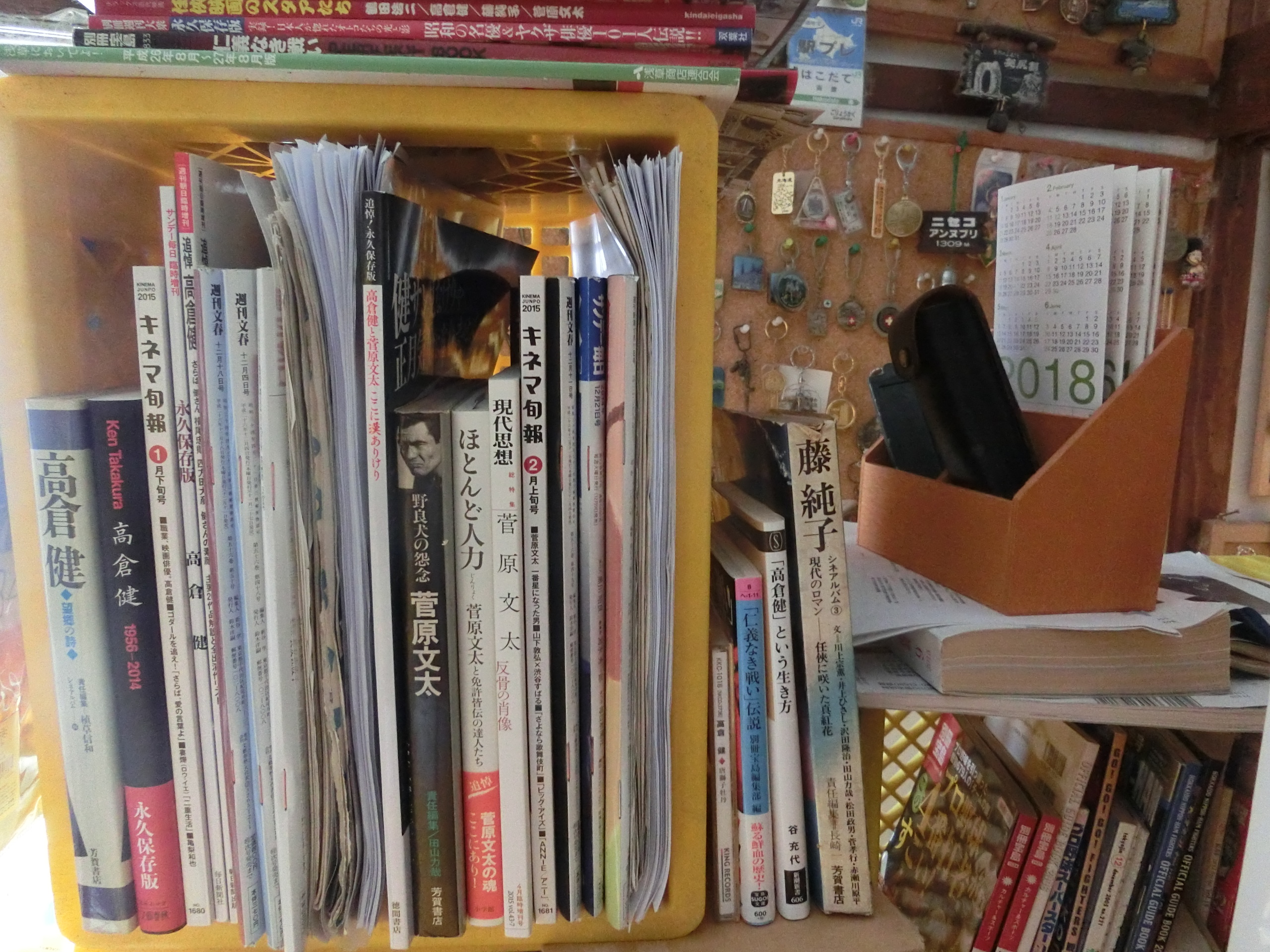 本棚に、高倉健と菅原文太の本と新聞と週刊誌ヤクザ映画に出ていた高倉健と菅原文太が好きだ。”ヤクザ”は大嫌いだが、”ヤクザ映画”は好きだ。中でも、高倉健の「昭和残侠伝」と菅原文太の「仁義なき戦い」は好きだな。他の映画も見たけれど、やはり彼らが出ている映画が好きだ。高倉健が歌う「昭和残侠伝」の主題歌「唐獅子牡丹」(義理と人情を~秤にかけりゃ~)は味があっていいな。元の女房である江利チエミはいい歌手だが(「酒場にて」「新妻に捧げる歌」)、彼女が歌う「唐獅子牡丹」よりも高倉健のぶっきらぼうに歌う方がいい。83歳で高倉健が亡くなったけど、菅原文太も日を開けずに81歳で亡くなった。非常に残念だ。高倉健は陰とすると、菅原文太は陽である。全く正反対の2人である。だけど、2人が共演したのは8~9本ある。ヤクザ映画も終わったが、終わってからもいい映画に出ていた。高倉健主演の「幸福の黄色いハンカチ」は非常に良かった。