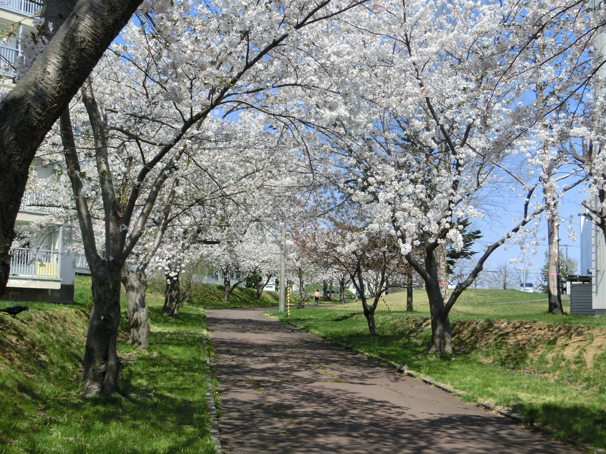5月5日こどもの日、非常にいい天気だった。札幌の予想最高気温が26℃、最低気温が8℃で、快晴の日だ。近所を散歩し、桜が満開だった。東北を旅した時は桜が満開だったが、今は札幌が満開だ。毎年、桜が咲いている近所に行ってみた。 桜が満開だ 近くの公園から見た山々左の小さな山が藻岩山、右の山は手稲山である。 手稲山