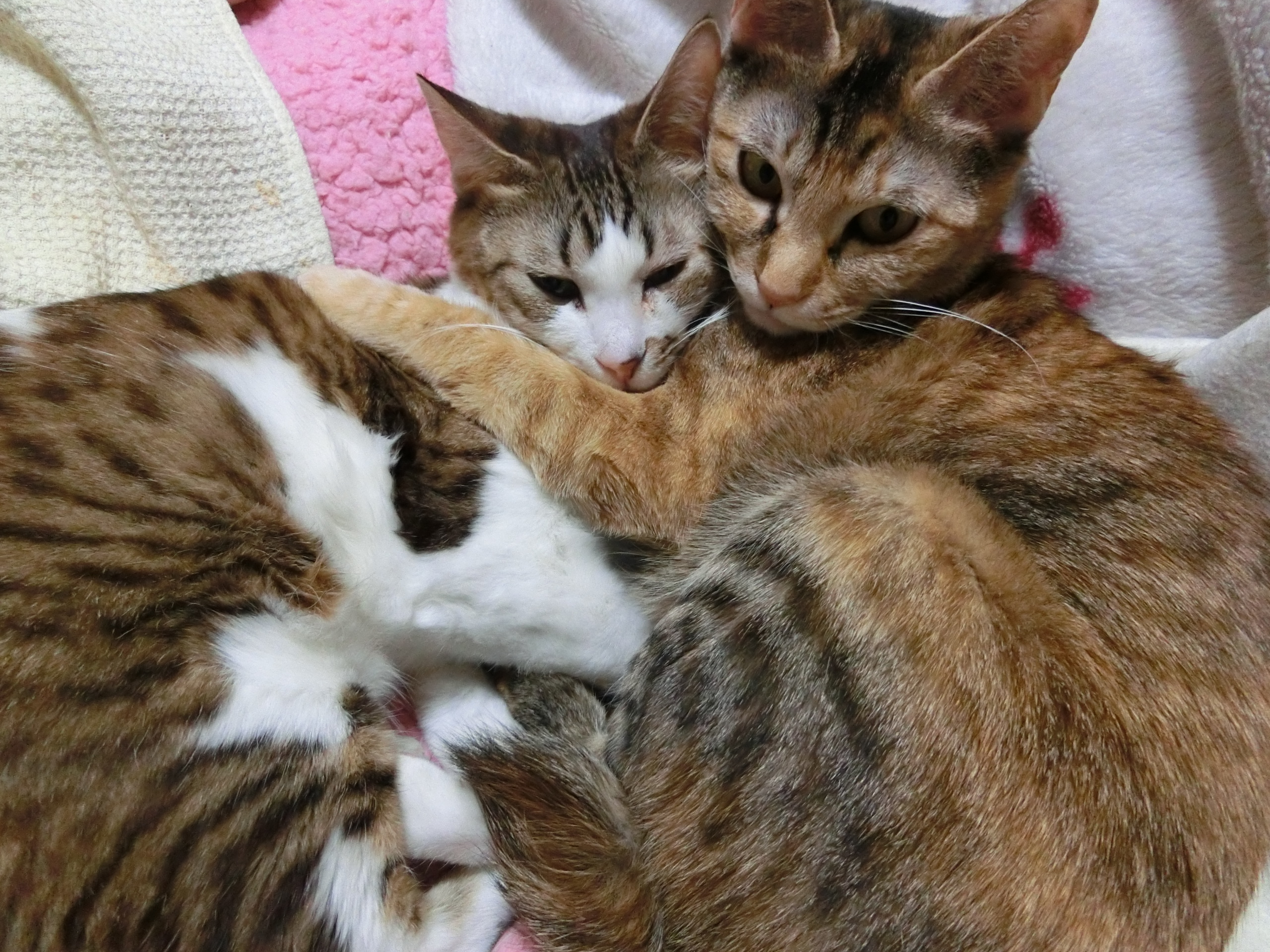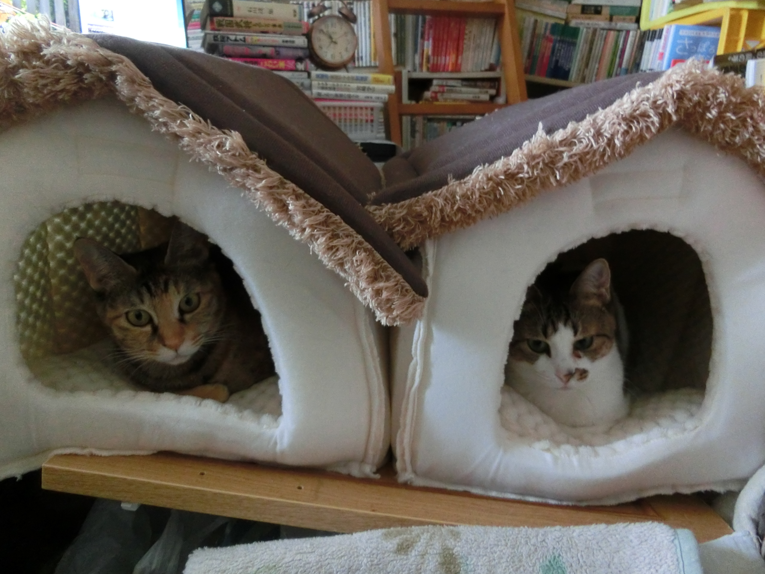 このところ、昼間は暖かいが朝晚は冷える。猫たちも寒さにはどうしようもない。ちょうどいい物があった、家で、屋根や壁をひっくり返して、下にフアフアを敷いた。 2匹とも元気でいい 狭いけどいい いつものところがいいか