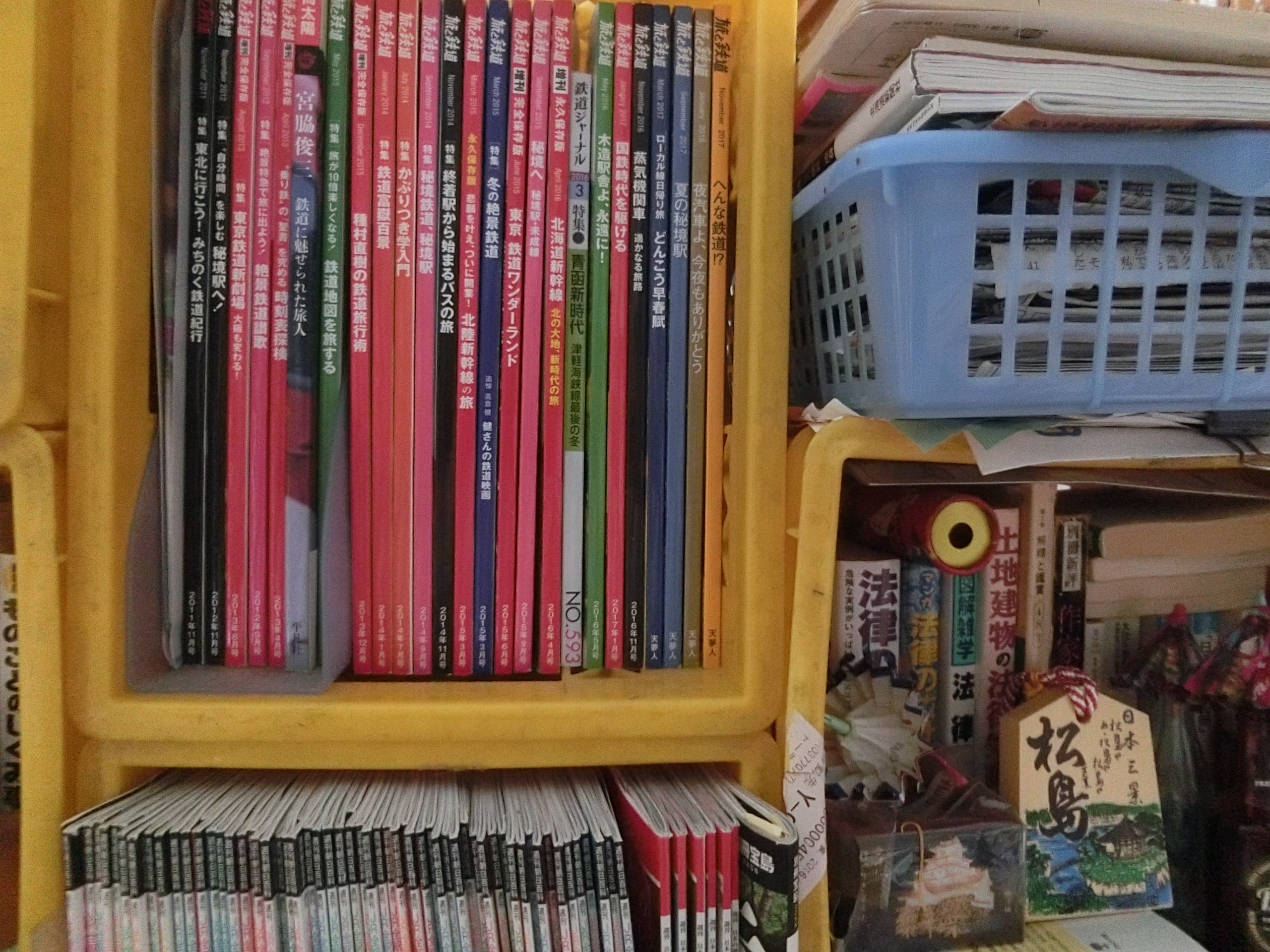 汽車の本はまだ棚にある旅が好きだが、おまけに汽車も好きになる。1日中汽車に乗っているのも好きだ。汽車に乗るとまず窓の外を見る、何遍も通ったところでも何か変わったところがないかと見る。今年の正月に”長崎・五島列島の旅”に行った時、小樽港から舞鶴港までフェリーで、京都府の舞鶴駅から長崎駅まで鈍行列車で行った。1日で行けず、舞鶴駅から博多駅まで朝5時半から夜10時まで13駅に降り、汽車を乗り継いで行った。さすがに13駅の2駅を違うホームに乗り、間違えて疲れたよ。