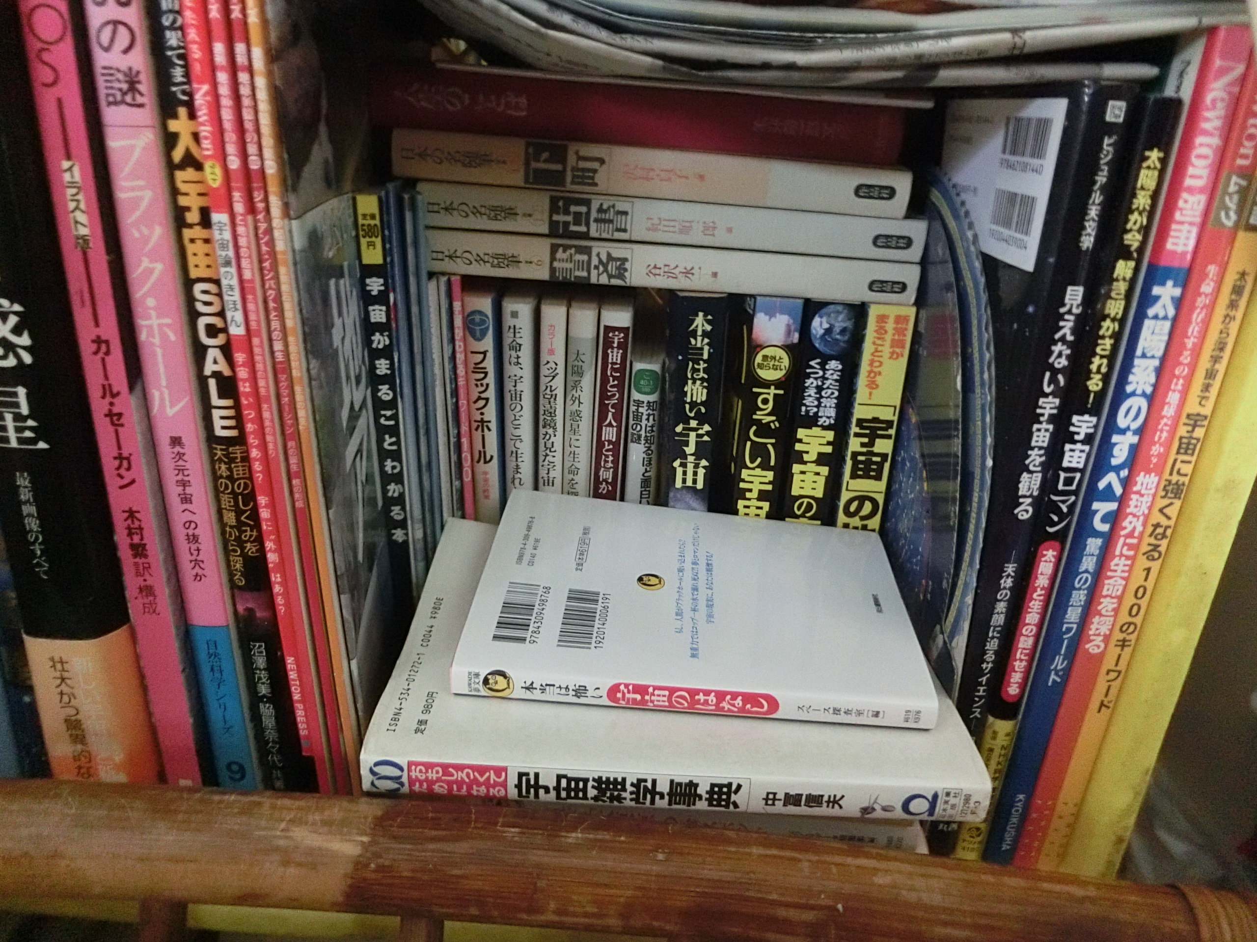 広い宇宙、宇宙の本がまだ棚にある 宇宙の本の1部 星座早見盤宇宙を見ていると、とんでもない大きな物である。太陽系が何千億あって銀河系を、その銀河系が何千億ある。我々太陽系から1番近い星(ケンタウルス座のα星)でも、光の速さで約4.36年は掛かる。地球の中でいざこざが起きるとは何と小さな事だと思う。小さな国同士が、争っている事をバカみたいに思えるよ。ちっぽけな地球を破壊しようとして、どうするつもりだろう。途轍もない大宇宙で、地球なんて小さなものだよ。小さな愚かな人間が多すぎる。戦乱に付ける薬はなし。宇宙の事を考えると、ちっぽけな事なんかバカらしくなる。 光の速さで120~130億年、気が遠くなる。想像出来ない。