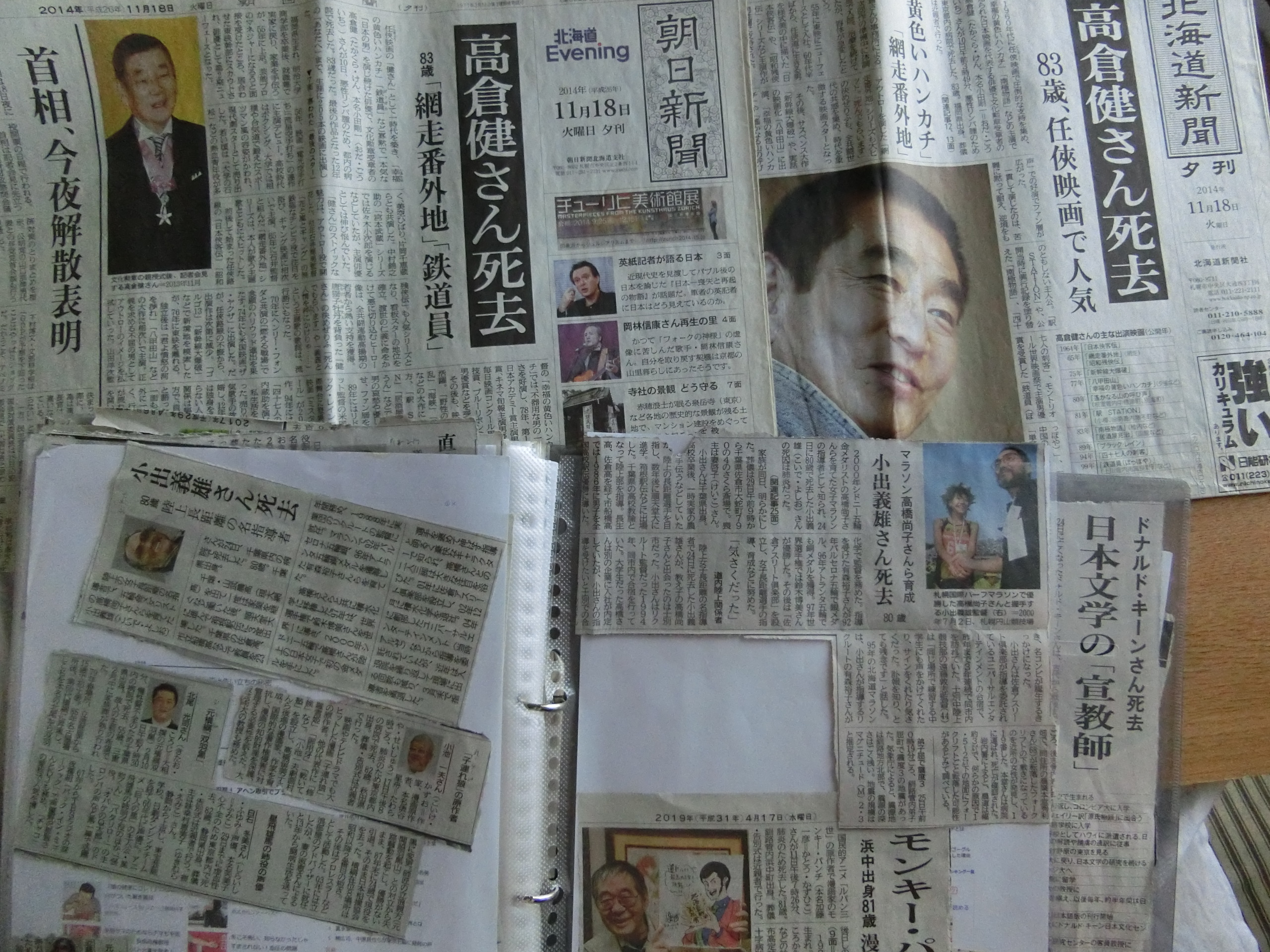 新聞のそのままと下のスクラップ帳新聞の切り抜きで、死亡記事を集め出したのはもう12年になる。映画俳優やタレント、作家、野球選手など、有名な人を集めている。何で亡くなったのか、いくつかそれを見ている。名を残した人でも、病気で亡くなるのだな。それを見ていると、いつか自分もそういう目に合うのだろうと思う。最近は、マラソンの高橋尚子の元コーチの小出義雄が亡くなった。高倉健は、たいぶ前に亡くなった。