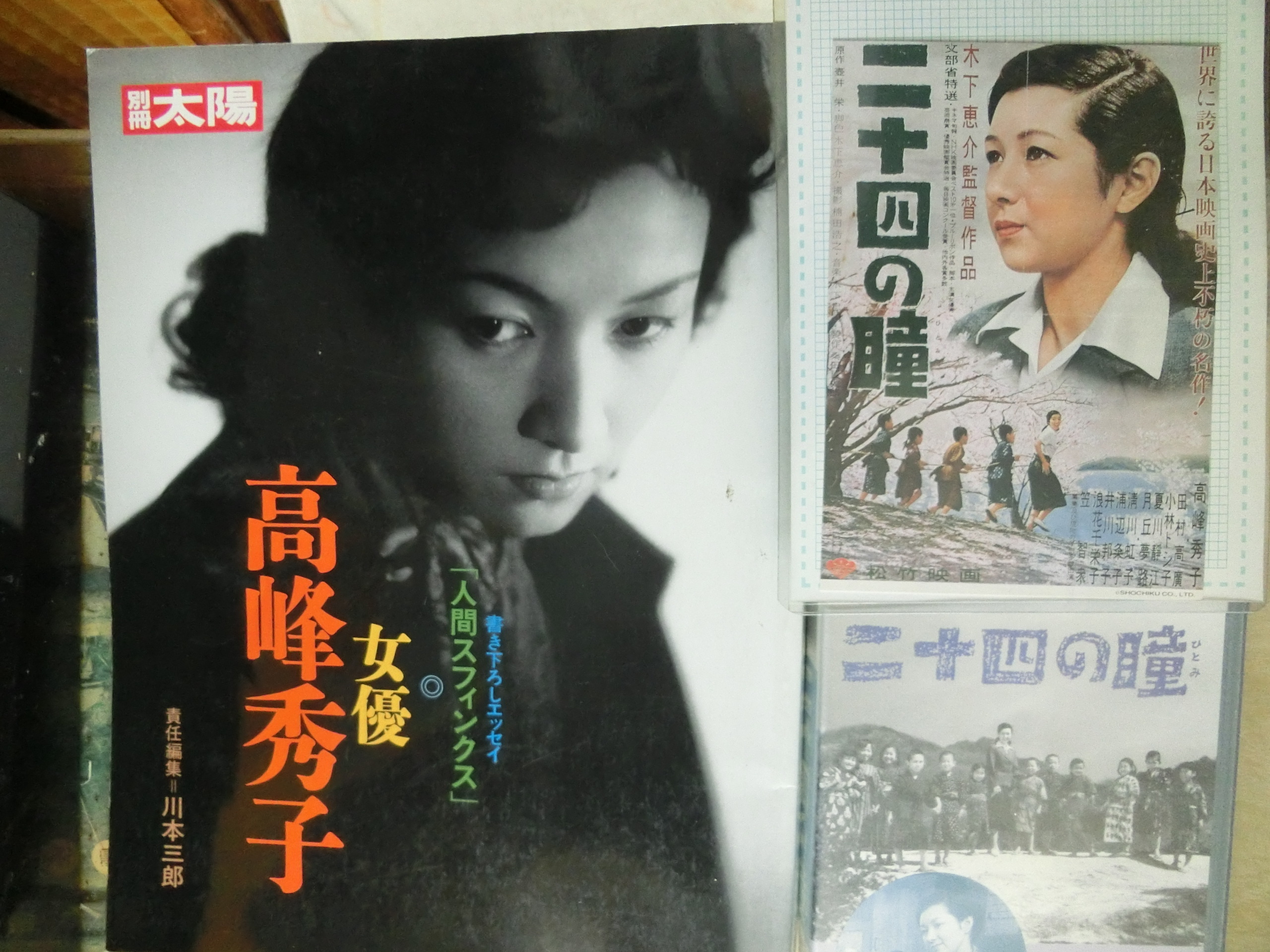 女優「高峰秀子」とビデオ高峰秀子は(1924年ー2010年)享年86歳で亡くなった。彼女の映画を見る様になったのは、20歳台の頃で「二十四の瞳」であった。「二十四の瞳」(松竹 1954年 木下惠介監督)は、反戦映画という事だ。最初は12人の子供が出てきて、後半は戦争が終わった立派な反戦映画だ。当然小説は読んだ。(新潮文庫 壷井栄著)最後のシーンは、戦争が終わって高峰秀子が学校に復帰する時、歓迎会が開かれて、生き残った8人が集まった。戦争で目が見えなくなった田村高広が、12人が写った写真を見て「これが先生じゃろ、こっちが〇〇じゃ」と「これだけは見えるんじゃ」と。月丘夢路が歌う「浜辺の歌」が、高峰秀子が雨の中、カッパを着て自転車をこいでいる画面に代わって、急に(仰げば尊し~)と「仰げば尊し」が流れる。そのシーンは最高で、涙が流れそうだ。そういう映画を見て、すっかり感動して高峰秀子のイメージを追って何本も見た。かなり見たけれど、「二十四の瞳」を超える映画はなかった。結構いい役もあり、「二十四の瞳」の役柄もあったな。高峰秀子は5歳の時、映画に出演して”天才子役”と呼ばれた。1972年(48歳)に現役を引退し、小学校を満足に行けなかったが、独学でエッセイを書く様になった。夫は松山善三監督で、2016年91歳で亡くなる。 本と切り抜き