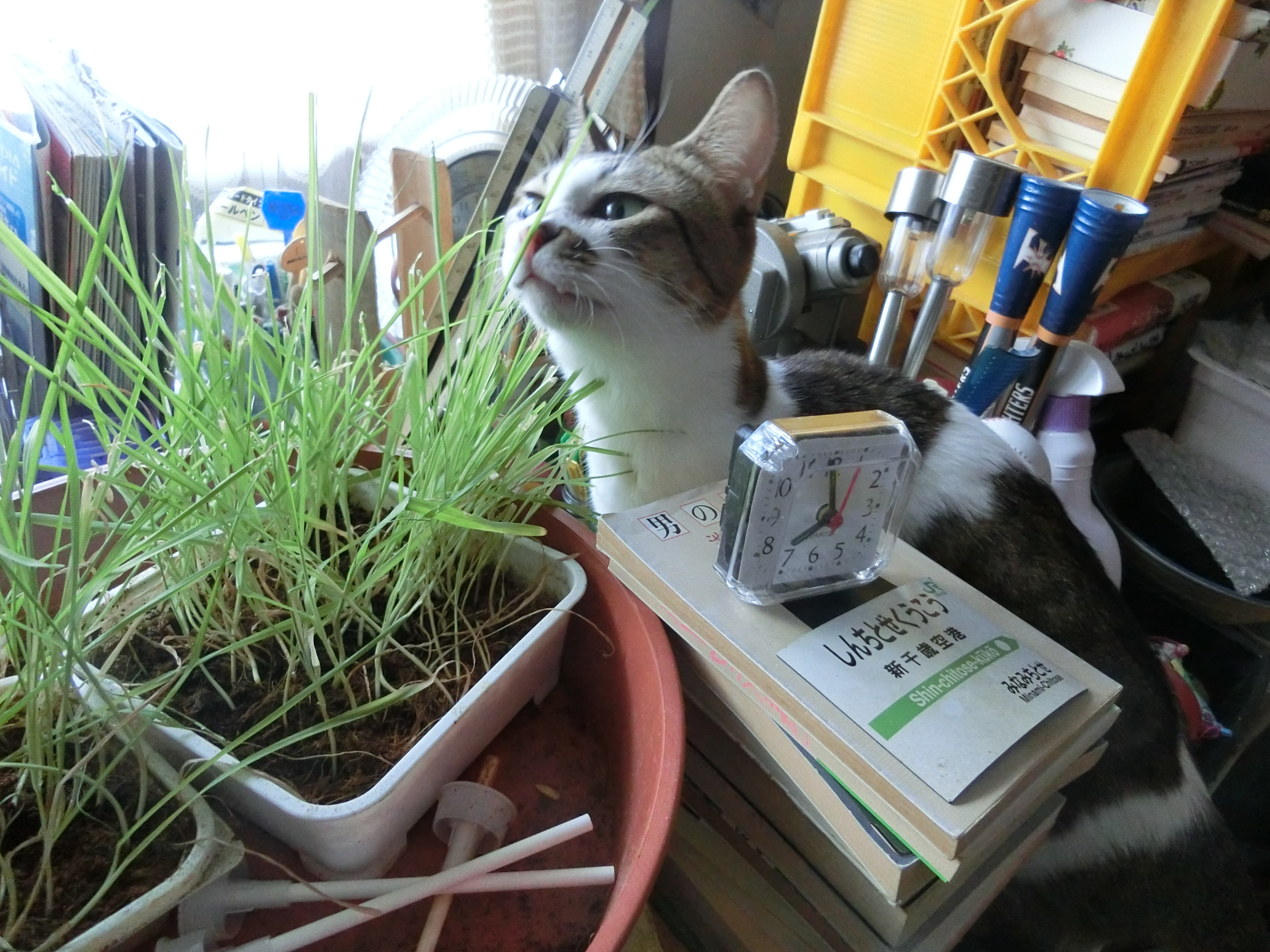 ある朝の出来事、猫が戯れている。草を食べるおすまし何を見ているカッコいいぜここまで登るかヒョイヒョイと登る猫は黙っていない。寝ている時は20時間ぐらいで、起きている時は歩き回る。何処でも行くから、写真を撮るにも容易じゃない。