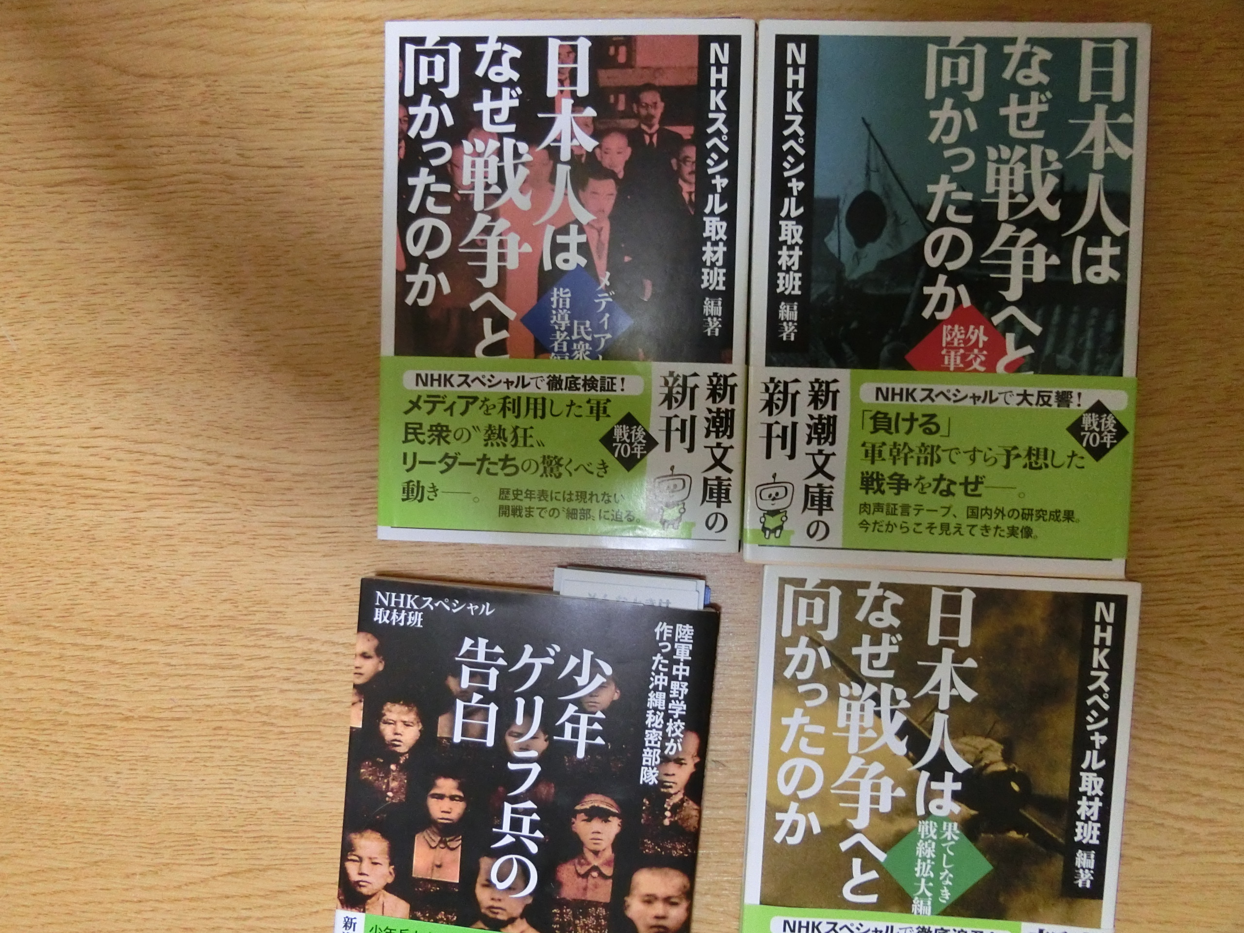 「少年ゲリラ兵の告白」(新潮文庫 2019年 NHKスペシャル取材班著)「護郷隊(ごきょうたい)」とは、太平洋戦争末期の1944年から終戦の年まで沖縄北部にいた遊撃隊(ゲリラ戦部隊)である。およそ1000人の部隊の大多数が、まだ10代の少年たちが兵士として戦場で戦っていたのだ。日本軍唯一の史上、他に頼を見ない特異な部隊だ。13歳から17歳までの、護郷隊の兵士として目を付けられていた子供たちだ。その死者は162人だ。元少年兵が戦場で実感したのは、虫けらをふみつぶすように扱われた命の軽さだった。「日本人はなぜ戦争へと向かったのか」(新潮文庫 2015年 NHKスペシャル取材班編著)第1部 外交・陸軍編第2部 メディアと民衆第3部 果てしなき戦争拡大編一言で言うならば、指導者たちの、継続的な、命に対する麻痺、人間に対する想像力の欠如である。メディアやリーダーが、意識的・無意識に犯した過誤であった。メディアは恐ろしい、戦争は二度と繰り返してはいけない。