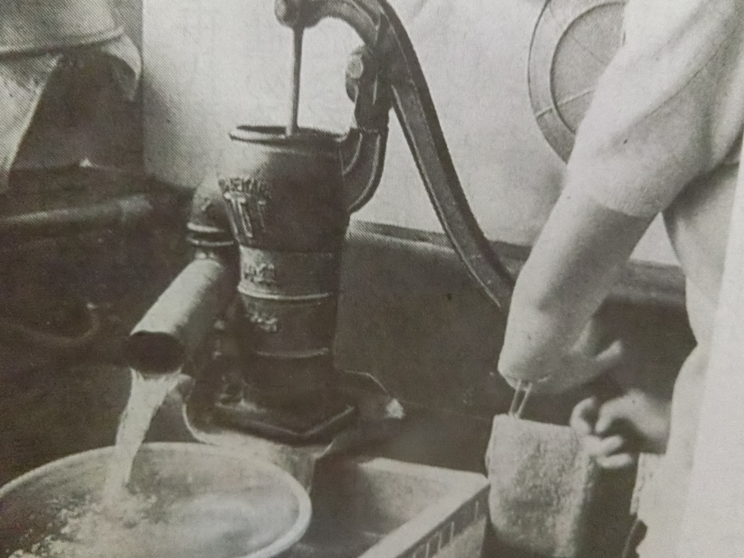 ガチャポンプ「ガチャ、ガチャ」と、鉄の取っ手と押すと勢いよく水が流れ出す。「ガチャポンプ」などの名前で親しまれた手押しポンプが、道内各地の家庭で活躍していた。水道が整備されるまで、飲み水の確保は大変だった。近くに良い湧き水があるといいのだが、雨が降ると水が濁ってくる。細菌や汚水の混入が問題となり姿を消してしまった。空になったポンプを、水が出るようにするのは、水を少し入れて最初はゆっくりと、最後に勢いよく「ガチャガチャ」と両手で押す。そうすると出てくる。いつもそうやって水を出していた。水道が取り付いて、うちにも水道水とガチャポンプ、同時に据え付けていたなあ。まあ湧き水があるといいのだが、いつの間にか姿を消してしまった。