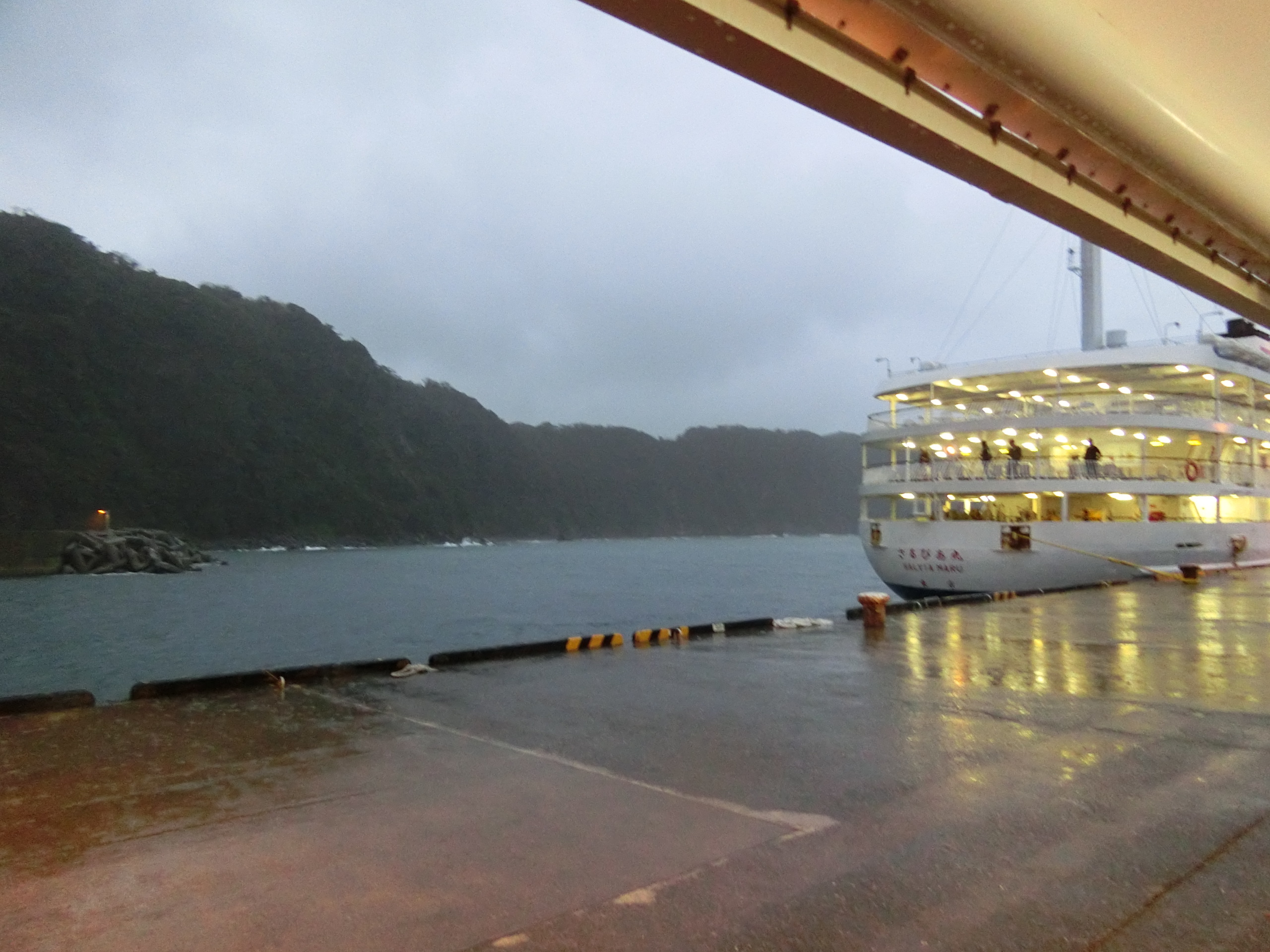 《伊豆大島》夜行のフェリーが、満員の椅子席で行く。深夜に、暖房が効き過ぎて暑い。冷房が効いている、終わった食堂がちょっどいい具合で、そこに寝た。朝6時に着く。目が覚めていると、小雨が降っていた。岸壁に着く。伊豆大島岡田港朝6時に着き、7時半までバスが来ない。皆、船を降りて何処へ行ったのだろうか。自分は波浮港(はぶみなと)へ行く為に、7時半にバスに乗り元町港に行く。始めは、どうしようかと思った。三原山(758m)は、何処にも見えないし、波浮港に行こうとした。波浮港に行くのは、自分と2人だけだった。岡田港は雨が上がった。岡田港岡田港から元町港までバスで行き、元町港から波浮港までまたバスである。20分と30分で、後は待合で1時間掛った。波浮港見晴台見晴らしがすごくいい。”都はるみ”が歌う「アンコ椿は恋の花」は、「~船が行く行く 波浮港~」という歌詞だ。波浮港見晴台の側に建っている。波浮港の街並み下に降りて、港を探索した。川端康成の「伊豆の踊子」のモデルになった、旅芸人が芸を披露した様子が再現された旧港屋旅館は、”踊子の里”資料館になっていたのだが。旧港屋旅館が閉館になっている。波浮港波浮港を見下ろす。地層大切断面スコリア、火山灰、土の3層で構成されている。元町港から波浮港の、バスの中から見える。元町港店屋が多く、一番の繫華街である。繫華街といっても、小さな島のうちだものだ。また、岡田港に戻ってきた。岡田港で、地元民から伊勢えび、サザエ、アワビなどを只で食わせてくれる。その他にソーメンを食って腹一杯だ。腹一杯で港を探索した。帰りの船は、人がガラガラであった。東京湾アクアライン