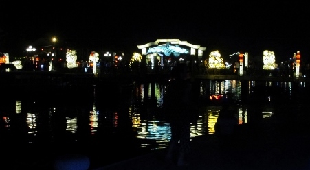 ホイアンの夜(トゥボン川に架かるアンホイ橋の夜景)夕方、ツアーバスに乗って出かけ夜のホイアンの街を観光しました。何組かの日本人観光客と一緒でした。外国で日本人に会うとなんだか嬉しいですね~先ずは絹織と刺繍の実演を見学しながらのお土産購入タイムでした。安心できるお店の様だったので蓮の刺繍を一枚買いました。額を外して貰ったので少しお安くなりました。(白い額はこちらで購入)お店には上質の絹のストールやアオザイの生地が色とりどり揃えてありました。アオザイはオーダーで二日後にホテルへ届くそうです。次に着いたところはアオザイを体験するお店でした。皆、仲良く選んで着て写真をパチリ!夫さんは着ていないので~写真を撮る役にまわってくれました。すっかり興奮してお腹がすいた頃シクロ(自転車の人力車?)が迎えに来ました。ランタンの灯る街をゆっくり眺めながらレストランへ。前に行くシクロが写っています。レストランの中です。上の方に帯が飾られていますね。ホイアンでは日本の帯の刺繍もしているそうです。日本語の上手な年配のオーナーでしたよ。メニューはホイアンの代表的な料理で下からホワイトローズ、揚げワンタン、カオラウ、コムガーにんにくの茎炒め、スープや揚げバナナのデザートも出ました。お腹いっぱいになった後はナイトマーケットの散策。しばらく自由時間でした。夜のホイアンは街全体が幻想的なランタンの灯りに包まれトゥボン川に浮かぶ小舟からはギターの音色がポロン、ポロンと聞こえてきます。なんともノスタルジックな世界でした。遠い昔、この街にたくさんの日本人が住んでいたのですね。本当に素敵な夜でした。また明日に。にほんブログ村よろしければこちらの方へも遊びに来てくださいね。