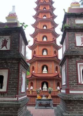 ホアンキエム湖からタクシーに乗って15分程の所にハノイで一番広い湖、そして一番美しいと言われているタイ湖があります。その湖に突き出た半島(キムグー島)に鎮国寺が建立されています。とても風情のあるたたずまいの、この寺院はハノイ市最古の仏教寺院と言われています。6世紀、李南帝(リ・ナムデー)の時代ホン川のほとりに建立されましたがホン川の土手が崩れてきた為、現在の場所に移設されました。(鎮国寺を象徴する仏塔)本堂には黄金の三世仏たち阿弥陀如来(過去仏)、釈迦如来(現在仏)、弥勒菩薩(未来仏)が鎮座しています。他に中国人が信仰する関羽、関平やベトナムの英雄チャン・フォン・ダオなども祀られています。本堂前の庭には大きな菩提樹の木が立っています。菩提樹は仏教の開祖である「ゴータマ・ブッダ」がその木の根元に座って悟りを得たと言われていますね皆が静かに木の下に立っていました。ひんやりと涼しく、心安らぐ場所でした。この菩提樹は1959年にインドのラージェーンドラ・プラサード大統領によって植樹されたものだそうです。「本堂」この寺院は夜になると、ライトアップされるそうです。タイ湖の夜景を楽しみにしながら一度家に帰りました。灯りが付き始めた頃、タイ湖畔のイタリアンレストランで夕食を頂きました。とても美味しかったです!息子お薦めのお店だそうです。夜景もとてもきれいでしたよ。(^。^♪さて明日はホイアン観光です。早朝、飛行機に乗るので早めにベッドイン。爆睡でした。(シルクのお土産)また明日ににほんブログ村ブログランキングに参加しています。是非ポチしてね。よろしければこちらの方へも遊びに来てくださいね。