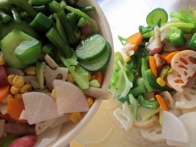 またも各地で激しい雨が降っています。同じ場所に猛暑が続いたり、豪雨が何度も発生したり本当に極端な天候が続いていますね。大気の流れに異変が起きているようです。広島市に起きた、おおきな土砂災害の被災者の方々に心からお見舞い申し上げます。私も少々バテ気味です。先日、JAで色々な野菜を買い込んで思い切って「百味サラダ」を作ってみました。これは土井善晴先生の「おかずのクッキング2011年8/9月号」に出ていたサラダです。なんだか元気になるサラダ!!野菜一つ一つを格好よく切り出してそれぞれ美味しいと思う茹で加減に茹でます。根や茎を食べる野菜は、よく茹でてざるに上げて軽く塩をふります。(余熱も含めて一つ一つベストの食感に茹でます)緑のきれいな野菜は、歯切れ良く茹でたら氷水にとって冷ましてからざるに上げます。少しだけ水にくぐらせて荒熱をとるだけのお野菜も~私は冷たく冷やして酢1と薄口醤油1とオリーブ油2のドレッシングでいただきました。色と食感を楽しむサラダ。一つ一つの野菜がそれはそれは美味しかったです!今回、ゴーヤのフライとセットになりましたが残ったサラダは2~3日冷蔵庫でOKでしたよ。孫達にも作って楽しませてあげたいな~わたくし、このサラダで元気に夏を乗り切ります(^。^)♪先日、ブランチにいただいたトマトとモッツァレラチーズのサラダ。オリーブオイルをかけて~採れたてのトマトがご馳走でした。こちらは人参ケーキです。冷蔵庫に残っているアーモンドプードルや黄粉も加えて~時々作るのですが、今回すごく美味しかったんです。黄粉が好みに合ったのかな今度、レシピを書きますね外は雨続きだけど元気で頑張りましょう。にほんブログ村ブログランキングに参加しています。是非ポチしてね。よろしければこちらの方へも遊びに来てくださいね。