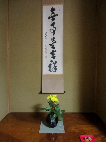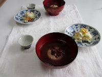 今年もささやかに初釜を催しました。「無事是吉祥」(泰道老師 筆)きりっと寒い部屋に薄っすらと雪明かりが射しています。青菜入りのおかゆを頂いて~静かに一服点てましょう。釜の湯がシュンシュンと煮えてきました。やさしく心に響いてきます。お菓子は村上製菓所さんの「垣穂」と美福さんの「はなびら餅」です。お茶は有機抹茶(宇治産)の新茶で。。明暗に変化する光の中・・・一服どうぞ。爽やかに春の緑を感じて頂きました。夫さんが初めて点てたお茶です。ホイップを立てるように点て始めたのでびっくり!笑いながら~膝の前には、お道具が散乱しています。一寸ぬるめの~まったり、やさしい味の一服でした。いつしか湯の温かさでほんのり~暖かい部屋になっていました。夕方、アカモク入り食パン(2斤)を届けに来てくれた娘に一服点てて今年もお互いに元気で過ごせますように祈りを込めました。3人で和やかな初釜となりました。 「夕飯に食べてね」と手作りも一緒に置いていってくれました。ありがとう!にほんブログ村ブログランキングに参加しています。是非ポチしてね。よろしければこちらの方へも遊びに来てくださいね。