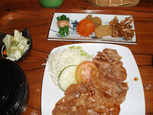 ところが最近、ランチセットができたのでたまに利用させてもらっている。35,000ルピアに税がつくから約40,000ルピアになって日本円で500円。メニューは4つ。チキンかつ定食、刺身定食、寿司定食、そしてこの豚のしょうが焼き定食。お茶もついてきます。ボリュームありで、メインの料理のほかに小皿料理がついてくるのがうれしい。お値打ちセットです。日本食をお安く食べれる店はやっぱりうれしいですね。