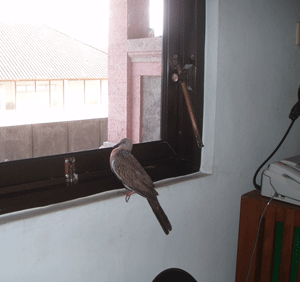 そうやって、この鳩をにらみ続けてどのくらい経ったろう・・・・。なんとか開け放たれてるドアに気がついたらしく出て行った。