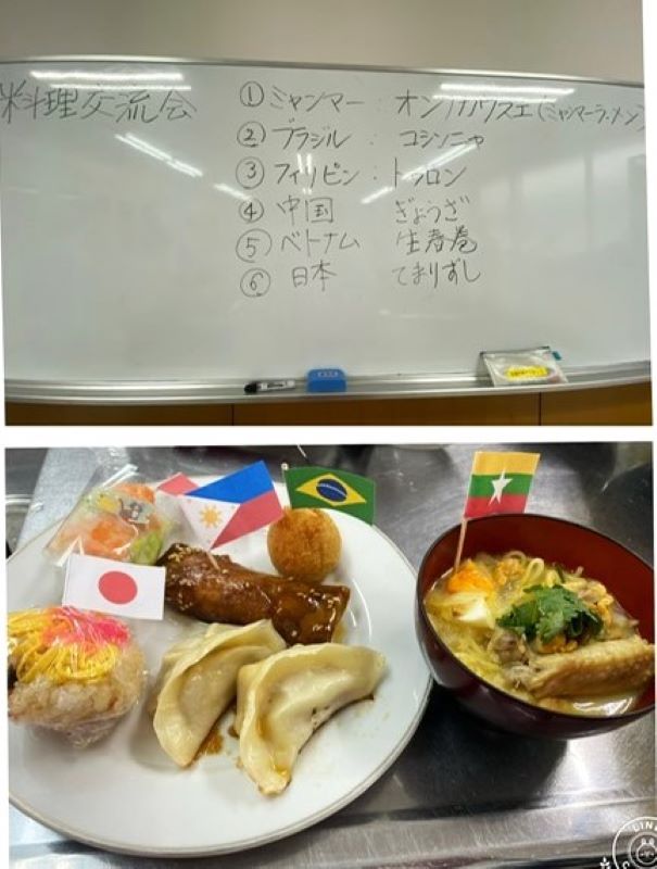昨日の午後は国際交流協会の料理交流会でした。午後1時前に自宅を出て準備。午後1時30分から4時30分まで6班に分かれてミャンマー、ブラジル、フィリピン、中国、ベトナム、日本の6か国の料理を作りました。全員で30名の参加でした。↑出来上がった料理です。ではその様子を紹介します。(皆さんのお顔をそのまま出してしまいましたが、マスクをしているのでお許しください。)子供さん達の参加者が多かったです。先ずは国ごとに6つの調理台に集合しました。そして具材を分けて順次調理にとりかかりました。子供さん達はお母さんにやり方を教えてもらってお手伝いをしました。次第に料理が出来上がってきました。各国の旗を立てて完成です。私はミャンマーのグループに入りましたので、オンノカウスエ(ミャンマーラーメン)は各自お椀をもって来てもらってから具材の入ったスープをお椀に入れました。(MIEAより拝借)パクチーとレモンと香辛料は好き嫌いがあるのでお好みで入れてもらうという事にしました。途中で市長さんが見えて各調理台を周られて皆さんと歓談し、各国の料理も食べて美味しい美味しいと言われました。置き場所がなくてミャンマーのお椀は全部写っていません。全員の集合写真です。(MIEAより拝借)各自がテーブルで食べながらお話をして交流しました。その後、後片付けをしましたが、主婦が多いので手際よく片付けられました。午後4時半過ぎにはすべて終了して、解散になったので参加者の皆さんは帰られました。委員会の代表者2名と事務局と私は最後まで片付けとチェックをして午後5時過ぎに帰りました。4時間立ち続けたからか両脚が疲れました。まだまだ筋力が戻りませんね。お風呂で温まってマッサージをしました。