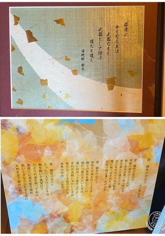 12月に2週間入院した病院で主治医から完治しましたと言われたので、昨日お見舞いを頂いた友人に快気祝いを届けに出かけたところ、珍しいものを見せていただきました。夕方だったので部屋の中では少し暗いからと広いお庭に出て写真を撮らせていただきました。友人は元当市の教育長さんで申し訳なかったです。実は彼の詩と短歌が広島国際会議場で開催されている「終戦80周年記念・広島芸術文化展・祈りの和」で展示されたので、ご夫婦で訪れたそうです。短歌は世界の各地から届けられた千羽鶴を(1年間で10トン集まるそうです)溶かして再生紙にし、その再生紙を取り込んでデザインした特殊な紙に書かれているのだそうです。先ごろ日本原水爆被害者団体協議会がノーベル平和賞を受賞したこともあり、学校の児童生徒を始め、とても多くの方々が訪れていたそうです。その様子を紹介します。30年ほど前に書いた詩や短歌を広島の方が見つけてこの度の「広島芸術文化展・祈りの和」に展示されたのだそうです。私も貴重な作品を見せて頂け嬉しかったです。