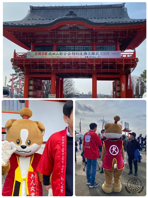 昨日(2/3)の事です。愛知の娘はお休みを取ってポコ君と犬山にある成田山新勝寺まで出かけました。節分会特別追儺豆撒式があったからです。犬山市の公式キャラクターのわん丸君です。成田山節分会特別追儺豆撒式で豆を撒く方々が勢ぞろいの中、メインゲストが空席になっています。成田山の僧侶とメインゲストを中心にいよいよ豆撒式の開始です。皆さん豆を拾おうとして大奮闘。ポコ君はすぐ前にいたおばさんの腕力で眼鏡がぶっ飛んで行ったそうで、我が家へ来てから眼鏡屋さんに行って修理してもらったほどでした。豆撒き式で拾ってきた豆と節分会のお守りです。実は桝を買わないといけなかったので娘はポコ君の分と2人分買ってきたそうです。私たち二人に拾った豆と水羊羹のおすそ分けとお守りのお札をくれました。実は別の目的もあったのでした。朝6時から並んだ人もいたそうです。午前の部は50名限定でしたが、運よく49番目に滑り込みセーフでした。そのことは後編に続きます。(つづく)