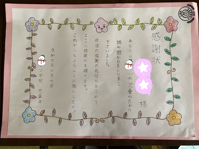 先日いつも読み聞かせに出かけている小学校の校長先生から「ありがとうの会」の案内状を頂きました。1年間お世話になった地域の方々を迎えて、児童による小学校のサポート隊の皆さんへ「ありがとうの会」を計画されたのでした。私は読み聞かせサークルに入っているので午前8時過ぎに出かけました。校長室で待っていると、児童が呼びに来ました。なぜか私が先頭で体育館に入場しました。名前の書いてある椅子に児童と対面で着席しました。午前8時30分から9時20分まで子供たちがお世話になっている方々の紹介があり、学校歯科医、給食センターの栄養士さん(代表)、PTA役員、読み聞かせサークル、地域の見守りサポーターなど約20数名が参加して、それぞれの代表が挨拶をしました。そして児童より感謝の言葉があり、それぞれ児童から全員に感謝状を頂きました。その後、しばらく出席者に関するクイズを3択で出して児童全員が答えるという楽しい時間を持ちました。次に児童全員で「ありがとうの歌」を歌ってくれました。最後に校長先生からの話があり、「ありがとうの会」が終わりました。「ありがとうの会」が終わって、校長室で雑談をしていると全員のメッセージがお花の花びらに書いてあり、体育館の壁一面に咲いていた「ありがとうの花」を児童がはがして持ってきてくれました。読み聞かせの出席メンバーで分けて持ち帰りました。こちらは私の分です。みんなの感想を読んでいると、子供たちの素直な感想が嬉しくてこれからも続けていきたいなぁと思いました。