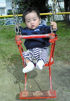 真っ赤なブランコにはポコちゃんが一人で乗りました.