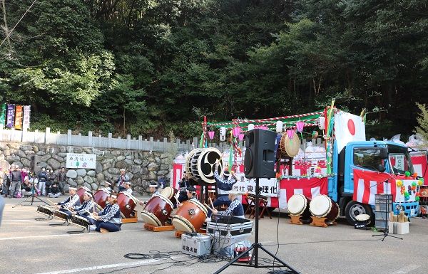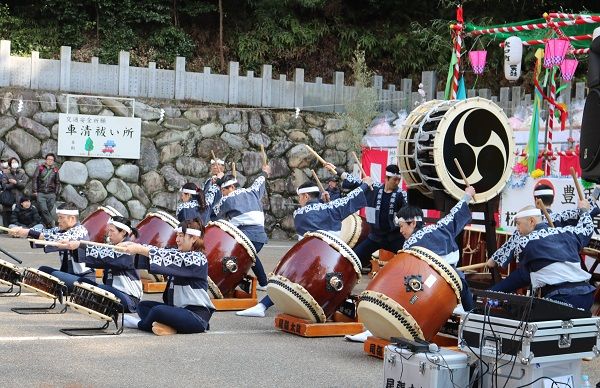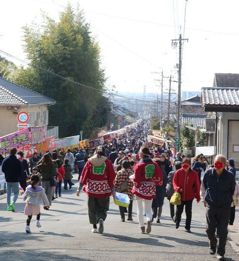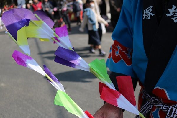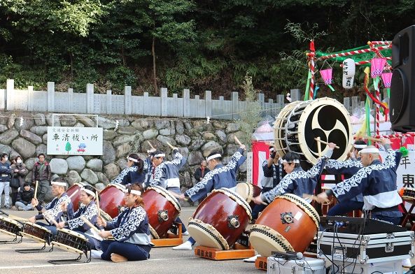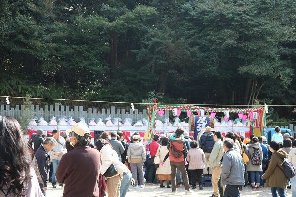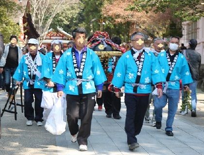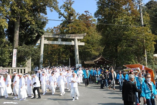 白装束の方々や法被姿で神輿を担いだ人たちが