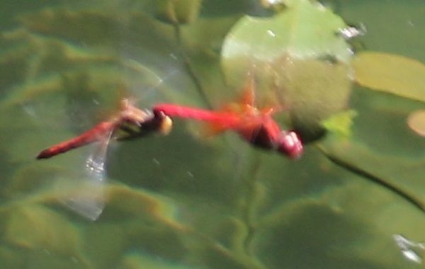 睡蓮の上で素早く飛び回る赤トンボ