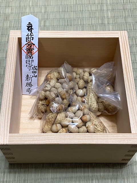 豆撒き式で拾ってきた豆と節分会のお守りです。