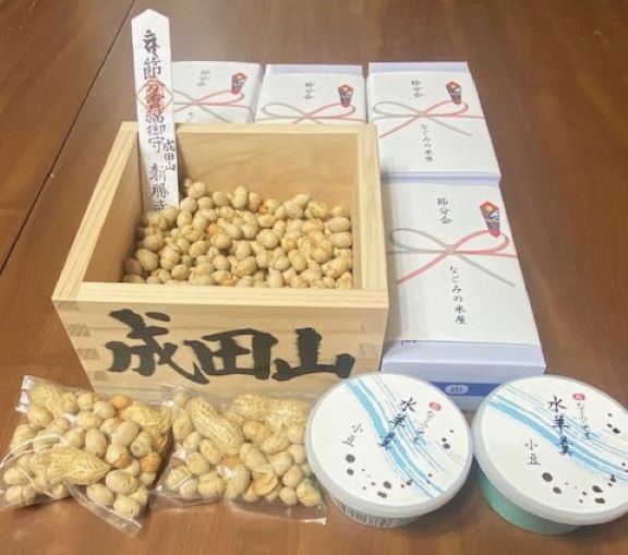 私たち二人に拾った豆と水羊羹のおすそ分けと