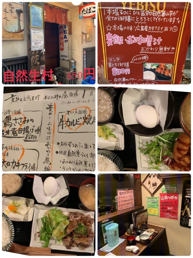 自然生村850円(税込)ご飯、お味噌汁お代わり無料メディアにも取り上げられてる有名店みたい。1210頃について、10分強の待ちでした。サーブも、早かった。何より、美味しい(๑>◡<๑)!!!納豆、おくら、モロヘイヤ等のネバネバ系大好きな私には、たまらなかった。牛カルビ定食。味付けが濃い目だから、ご飯が進む。しっかり、ご飯、お味噌汁もお代わり(^^)v一緒した同僚は、カキフライ定食。サクッと揚がってる良い音してたよ。牡蠣自体も、質が高かったって。麦ご飯なのも、良いわぁ〜☆ ☆ ☆ ☆ ☆山芋・長芋・自然薯、とろろ…使い分けた事なく、疑問になり、今更ながら、調べてみた↓諸説あるらしいが、山芋とは、ヤマイモ科に属してるものの総称。日本原産のものを、自然薯というらしい。外来ものを長芋という。生の山芋、長芋をすり下ろしたものを、とろろと言うんだって。このお店、リピ決定!!!