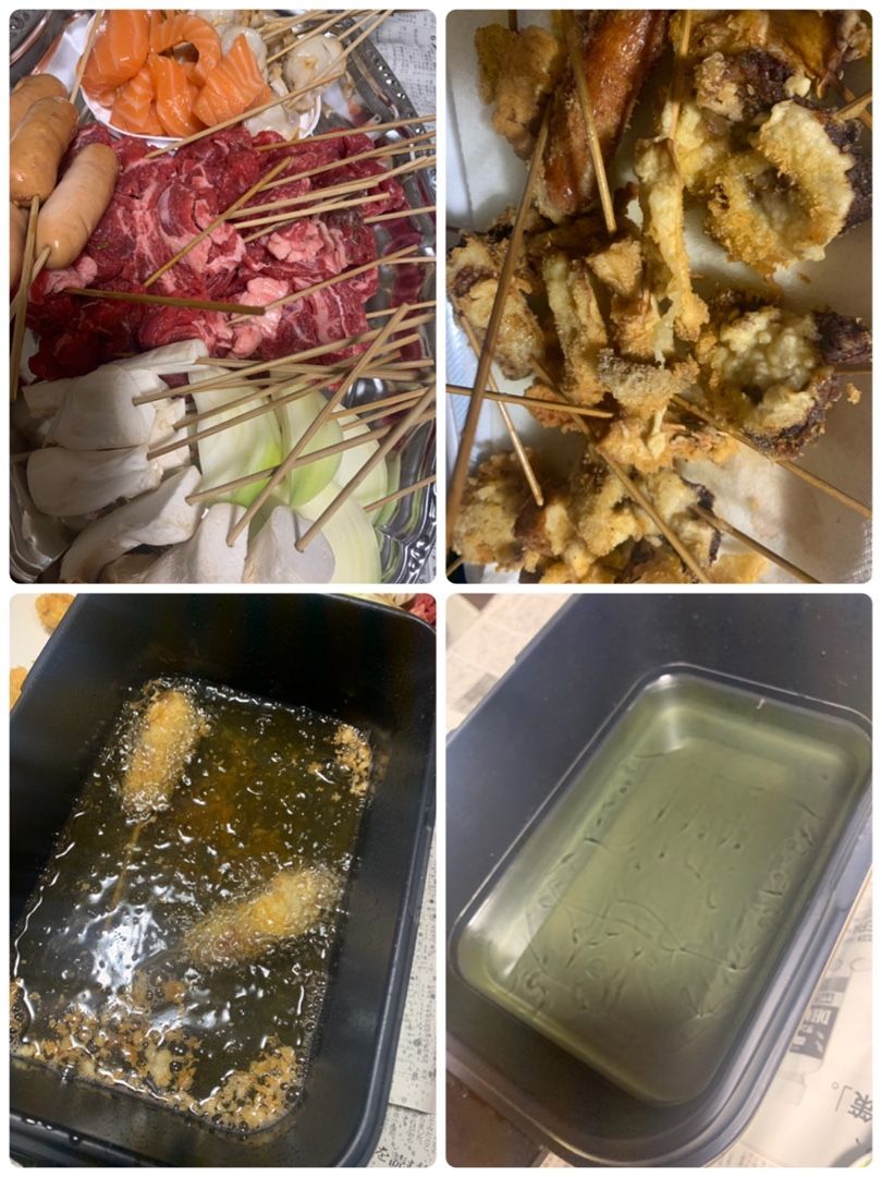 具材、バッター液、パン粉をテーブルに置いて、 セルフサービス方式。 こりゃ、楽チン♪ と思いきや、 油跳ねるし、熱いとナナはセルフせず、 食べながら揚げたり、結局忙しく、 落ち着いて食事できなかったʅ(◞‿◟)ʃ 部屋中、油の匂いするし、テーブル周りは、油ベトベト。 後片付けなど考えると、次回開催は、かなりの未来だろうな。 でも、揚げたては、やはり、美味しかった(o^^o)