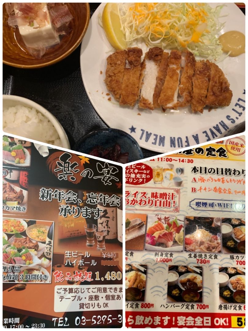 楽の宴 トンカツ定食 700円(税込) ご飯、お味噌おかわり無料 西口 徒歩 1分。 方向音痴な私でも、すぐに、わかるロケーション。 外ランチ行く機会増えたから、だいぶ 神田駅界隈が わかってきたしね٩(^‿^)۶ ランチ時でも、喫煙可なお店。 喫煙者の私だけど、ランチ時は、やめて欲しいなぁ。←ザ・自分勝手( ̄∀ ̄) 無料なご飯、お味噌汁はお代わりするほどでは、なかったけど、このお値段でトンカツが食べられるなら、良し!