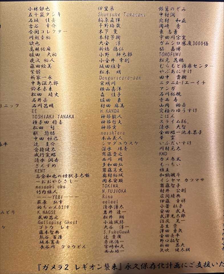 ガメラ2のクラウドファンディングの参加者名が入ったプレート。自分の名前もちゃんとありました!
