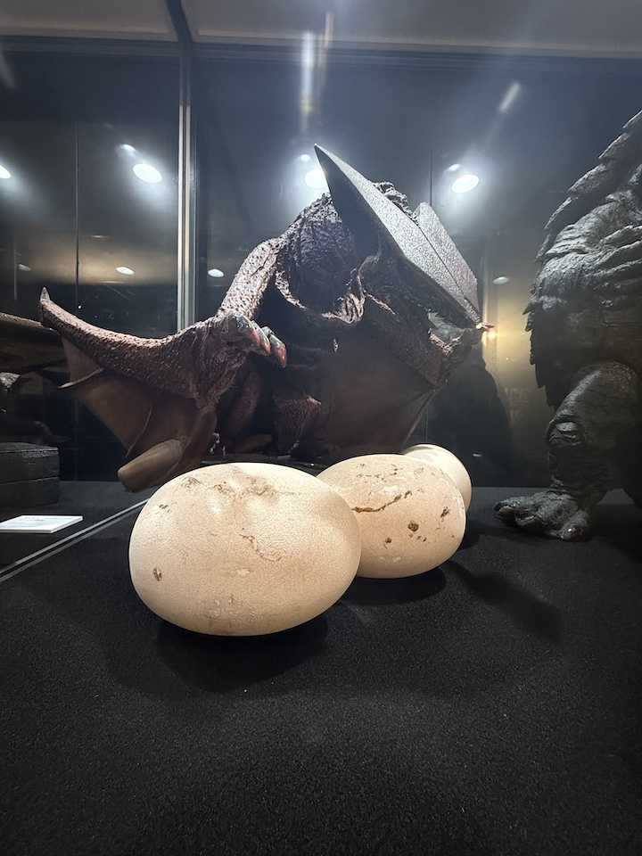 「大怪獣空中決戦」のコーナーには残存するスーツなどがあまりないようで、ギャオスヘッドや遠景用ミニチュアなどが展示されていました。個人的に好きなのは東京タワーに巣を作ったギャオスのシーンで、屋外で撮影した夕日のシーンは秀逸です。今回はミニチュアギャオスのみ展示されていました。