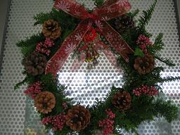 生クリスマスリース、完成しました!初めて作りましたが、思ったより簡単でした。ヒバの葉を土台にさしていき、その上からワイヤリングした松ぼっくりとペッパーベリーをつけました。最後に100均で買ったベルのオーナメントをつけ、リボンで飾りつけ。ワイヤーの締め付けが甘いので、ちょっと心配です。でも、なかなか可愛くそれらしく出来て満足です♪生のリースって買うと高いけど、自分で作ればとってもリーズナブル。今回は約1500円で出来ました。
