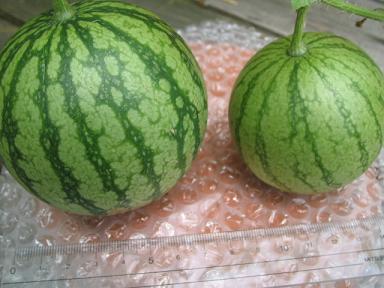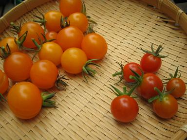 ミニトマト(赤&黄)収獲。ミニトマトは2株育ててますが、てっきりどっちも普通の赤いのかと思ってました。が、片方のが黄色い実のままぜんぜん赤くならない。おかしいなと思ったら、黄色い品種だったみたい。何個か割れてしまってました。慌てて収獲しました。フルーティでおいしかったです。小玉すいか。今2つ生っていて(赤&黄色)、大きいほうは4~5cmくらい。2回目の受粉したのも少しふくらんできました。楽しみだ~♪つるブルームーン。かなり薄い色で咲いてます。