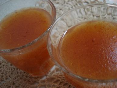 いただいた柿がひとつ熟々になっていたので、柿ようかんを作ってみました。といっても、寒天で固めただけですが・・・。柿はそのままで十分どろどろでしたが、ミキサーにかけて滑らかにしました。四角いほうが羊羹らしいけど、デュラレックスのグラスを容器にしました。味は、羊羹というより寒天だけど、柿の味がちゃんとしておいしかったです。ヘルシー~?