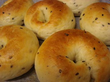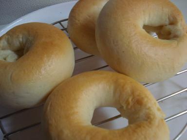ベーグルリベンジです。前回初めて作ったときは、水分が多くてべちゃべちゃだったので今回は水分少なめのレシピをさがしました。コネはHBで15分くらい。水分が少ないのでガタガタしてました。生地はべたつかずいい感じ。やっぱり前回のは水分多かったのね。分割して丸めベンチタイム。その後成形して30分ほど発酵。モルトを入れたお湯で20秒くらい茹でたあと、オーブンで焼きました。見た目はいい感じ♪もちもちしてるけど、ちょっと固めかな?でもおいしかった。バターやジャムをぬって食べました。成形後、発酵前。穴が大きくてドーナツみたい・・・。シュウマイ初めて作りました。餃子みたいに包まなくていいから楽は楽ですが、けっこう難しかったです。餡は、豚挽き肉・玉ねぎ・干ししいたけ・しょうがなど。10分ほど蒸して出来上がり~♪意外と簡単なんですね。1個1個が小さいからペロっと食べちゃいました。ご近所のおばちゃんから頂いた柿とみかん。柿は熟してて甘かったです。みかんはまだ青いのでもうちょっとおいてから食べます。