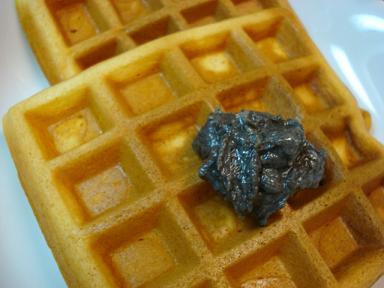 アメリカンワッフルを作りました。久しぶりにワッフルメーカーの出番です。BPをきらしていたので、ホットケーキミックスを使いました。材料は卵・牛乳・はちみつ・塩・溶かしバター。混ぜて焼くだけ。簡単~(^_^)vふわふわしておいしかった♪黒ごまペーストとクリームチーズを混ぜたものをつけて食べました。まあまあおいしかったけど、わたしは何もつけずそのままのほうが好きかも。2枚目からはそのまま食べました。そしてまた食べ過ぎたのでした・・・(^_^;)黒ごまペースト。