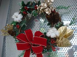 玄関用のクリスマスリースを作りました。毎年、ヒムロ杉や孔雀ヒバなどを使ったフレッシュリースにこだわって作ってましたが、今年は簡単に。ちょっとボリューム抑えめだったかな?こちらは室内用のリース。クリスマス柄のリボンを台にグルグル巻いただけ。