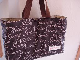 オーダーのミニバッグ。前に頼まれて作ったバッグを気に入ってくださって、同じ形で秋冬っぽいのが欲しいとのこと。前のは白地のハワイアン柄で夏っぽい生地でした。落ち着いた色のナイロン生地を何種類かピックアップして、その中から選んでもらいました。茶色地にベージュピンクの英字柄。間にキルト芯を挟んでるのでふかふかです♪両サイドに外ポケ1個ずつ、内ポケ1個。マグネットボタンで留められるようにしました。