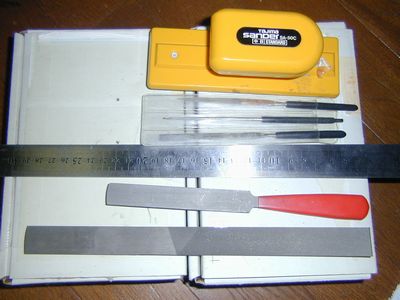 今日は休みだったので以前フレット打ちをしたアリアのストラトタイプのフレット打ち直しをやりました。何箇所かフレット浮きしているような感じがあったので思い切ってフレットを抜いて打ち直し。今度はちゃんと打てましたさあここからが問題。以前打ったフレットと高さを揃える摺り合わせをしなくちゃなりません。打ち直した部分を中心に少しずつフレットの頭を削って高さを合わせます。削っては金属定規をあてて高さをチェック、それを繰り返して高さは揃いました。次はフレット専用やすりでフレットの頭を丸くしていきます。その後1500番のペーパーとフレット磨きクロスで磨き、最後にコンパウンドで仕上げました。まだ終わりじゃないんですね~弦を張って音がちゃんと出るかの確認作業、一フレットずつ音を出していきます。上手く高さが揃えられたようで詰まったりする箇所はありませんでしたやっぱりフレット関係の作業は手間がかかりますこれが今日摺り合わせに使った道具類です。