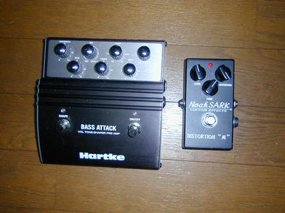 今日は先日オークションで落札したプリアンプとディストーションが届いたのでいろいろ遊んでいました。落としたのはこの二つ。一つはHartke Bass Attack。所謂プリアンプですね。これをアンプのプリ部の代わりに使います、ベースアンプのリターン端子に突っ込んでやります。するとあら不思議(笑)Hartkeの音になります。なかなか良い感じですね、Hartkeのアンプが欲しかったけど買えなかった僕のような者には大変ありがたいです。細かいことはこちらを見た方が早いかも。Hartke VXL Attack - Bass Pedal【特価品】もう一つはNoah SARK Distortion"M"これ知らなかったんですけど結構いろんな種類が出ているようで。僕が手に入れたMはマーシャル、Bというのもあってそれはブギーを意識しているようです。これジャンクで音がちゃんと出ないことが多いという話だったんですけど開けてみると何とも無さそうで使えなさそうな電池が入っていたのを外してアダプターを繋いで試したら問題無く鳴りました(ラッキー!!)ちょっとザクザクした感じの歪、ノイズも少ない。う~ん、良い感じ。細かいことはやはりこちらでNoahSARK DISTORTION"M"二つとも半額以下で手に入りました、両方完動で傷も殆どありません。う~ん、満足満足