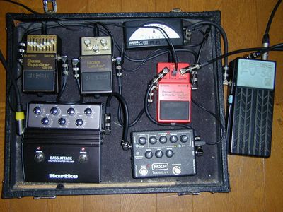 ベース用のエフェクターボードを先日組み換えたがやっぱりケースが小さいということで新調することに。まだ届かないので同じ大きさのギター用にしていたケースを使って新しいケースはギター用にすることに。先日組んだケースはこれ ボリュームペダルがはみ出してるそんで今日組んだケースはこれ やっぱりペダルもケースに入った方が使い易いからチューナーはボリュームペダルのチューナーアウトに接続。赤いBOSSのPSM5はパワーサプライ&マスタースイッチ。そのループの部分にリミッターとイコライザーを接続してます。普段はボリュームペダル→PSM→MXR→HARTKE→アンプという形になります、今やってる音楽だとリミッターの出番が少ないんでループさせてるんです。因みにパッチケーブルはモガミの2534(マイクケーブル)をセミバランスにしたものを使っています。パッチの場合はセミバランスじゃなくても良かったかもしれませんが作るときそう作っちゃったんで楽器用には折角高いケーブル使っててもエフェクターのパッチにお粗末な物を使ってる人も見かけますけどそうすると高いケーブル使ってもその性能は十分には発揮できませんので。今まで使ってたベース用のケースにギター用のエフェクターをとりあえず入れてみた。 う~ん、入りきらんギター用は歪物2つをその時々で組み替えて使うから・・・・でも歪物有り過ぎなような気もするが、まあいいかそれにしてもギター用のエフェクターはいつ使う?
