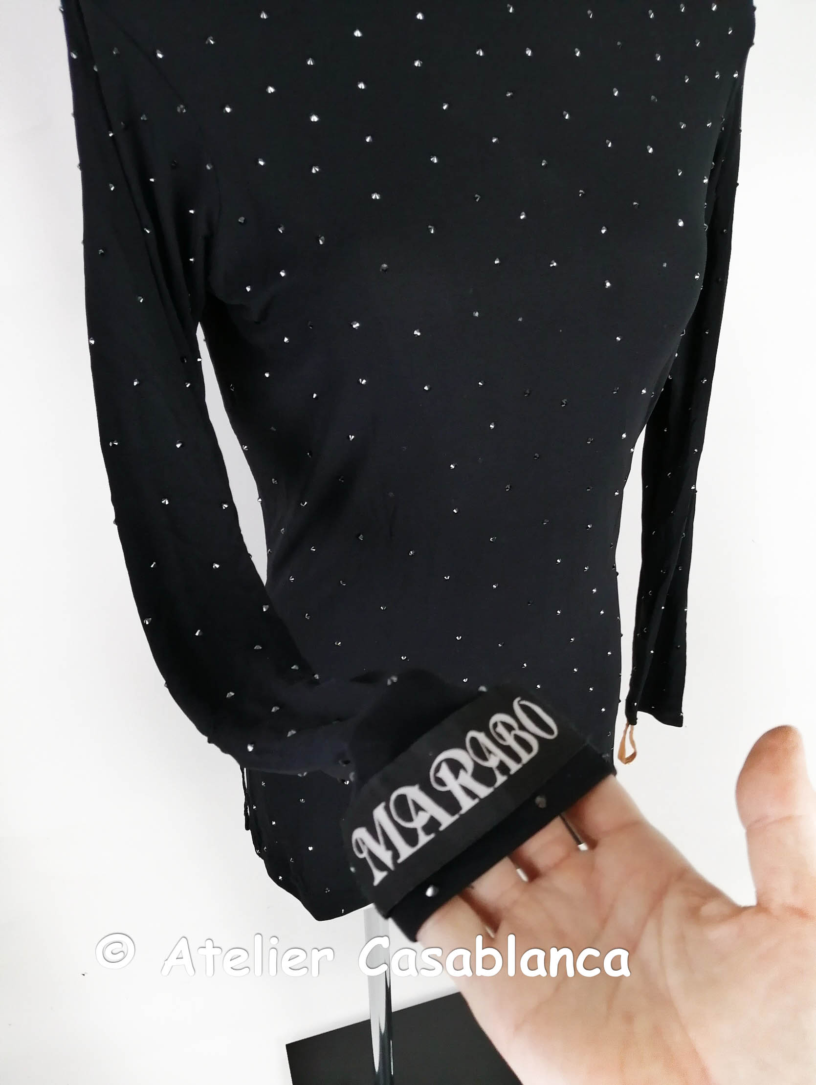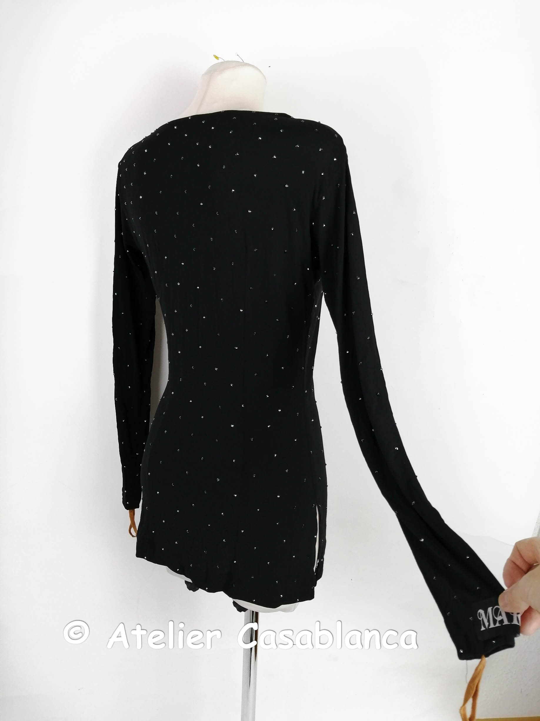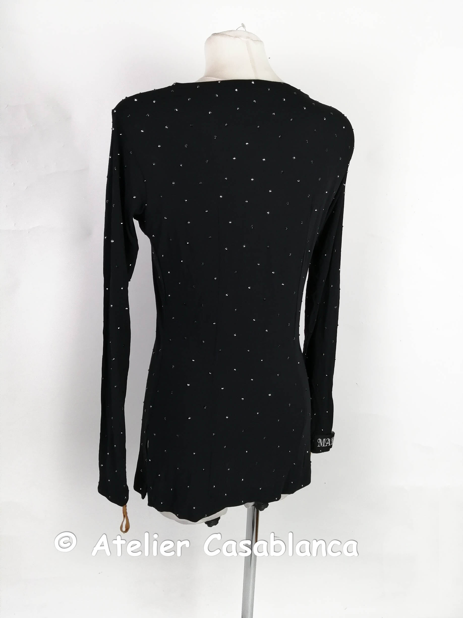 オーバーブラウスタイプで両サイドにスリットが入っており、シャツ全体に黒のスワロフスキの石が貼られています。