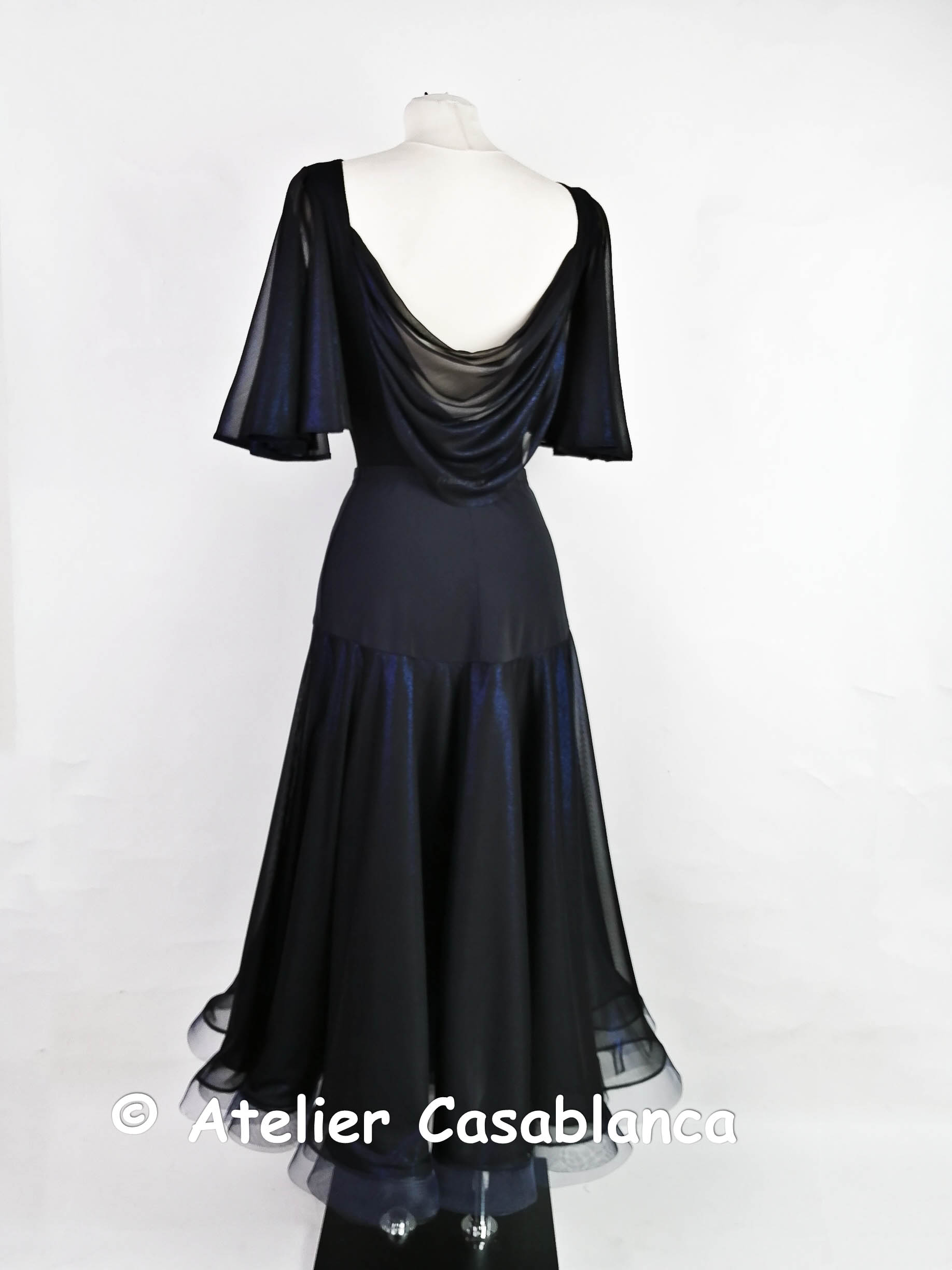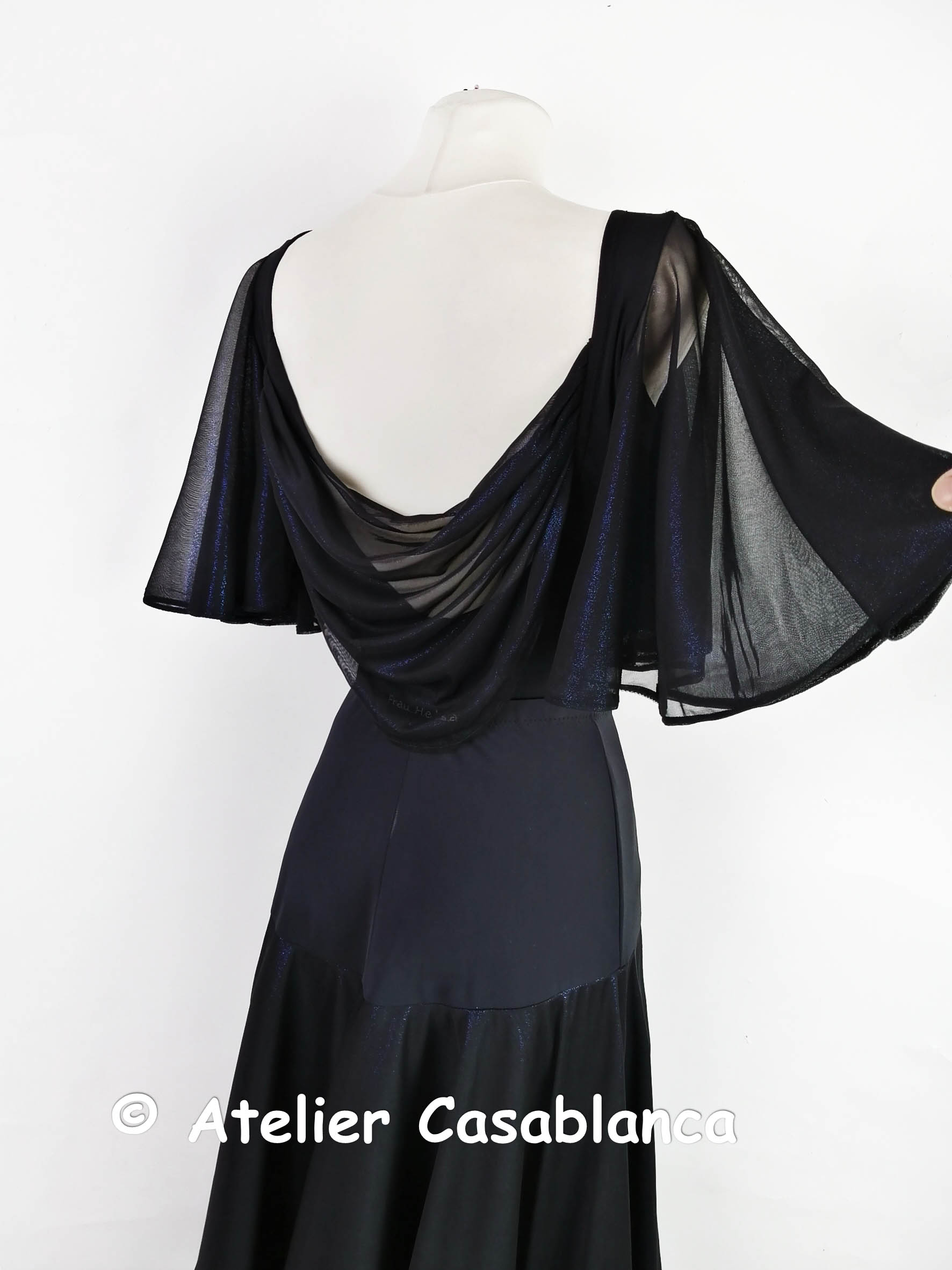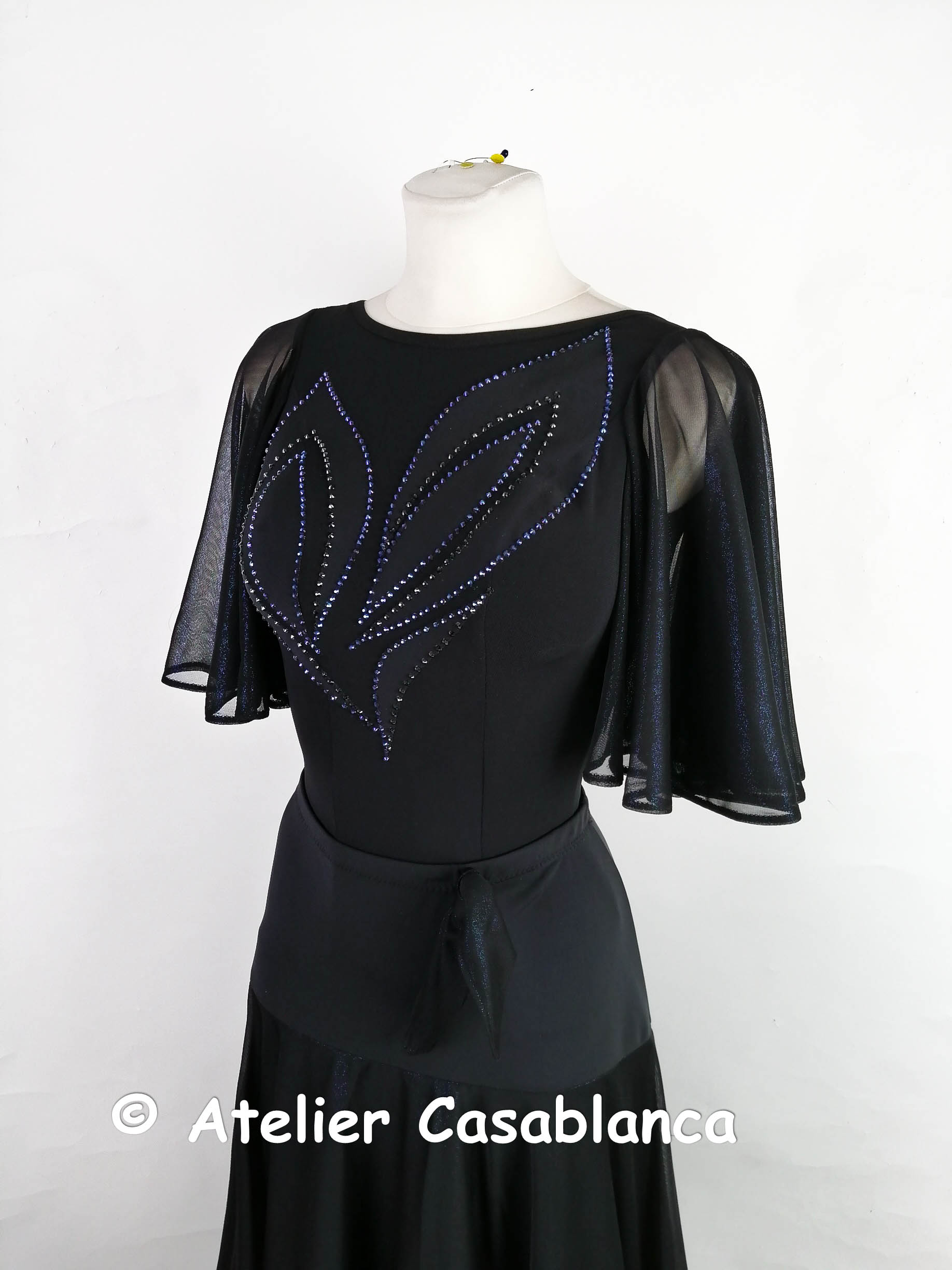 管理人超おすすめ!超素晴らしい縫製、オリジナリティのあるデザイン、高品質で着心地の良いつくりが大変素晴らしい、ウクライナのダンスドレスデザイナー、「フラウ・ヘルガ」(現在ドイツ在住)のブルーの繊細なラメが入った黒のジョーゼットを使った超!スタイル良く見える黒のレオタードとスカートのセットアップです。未使用の新品。