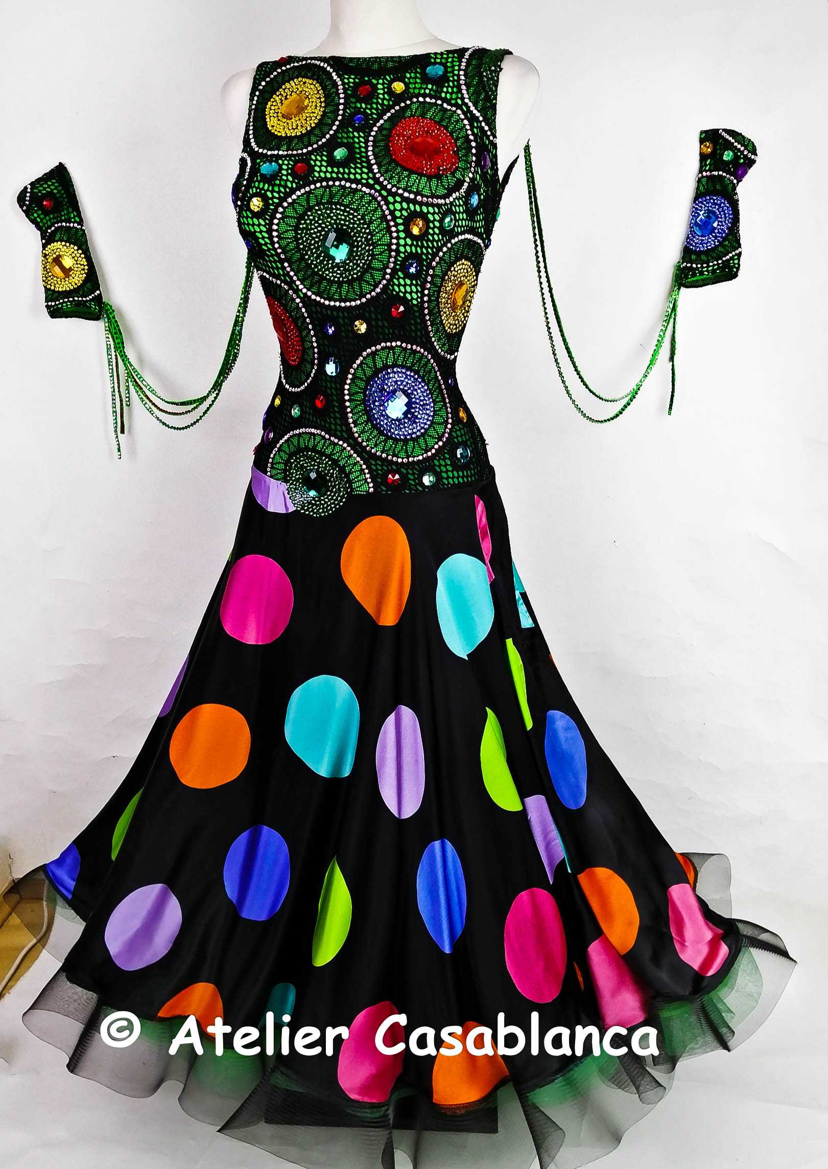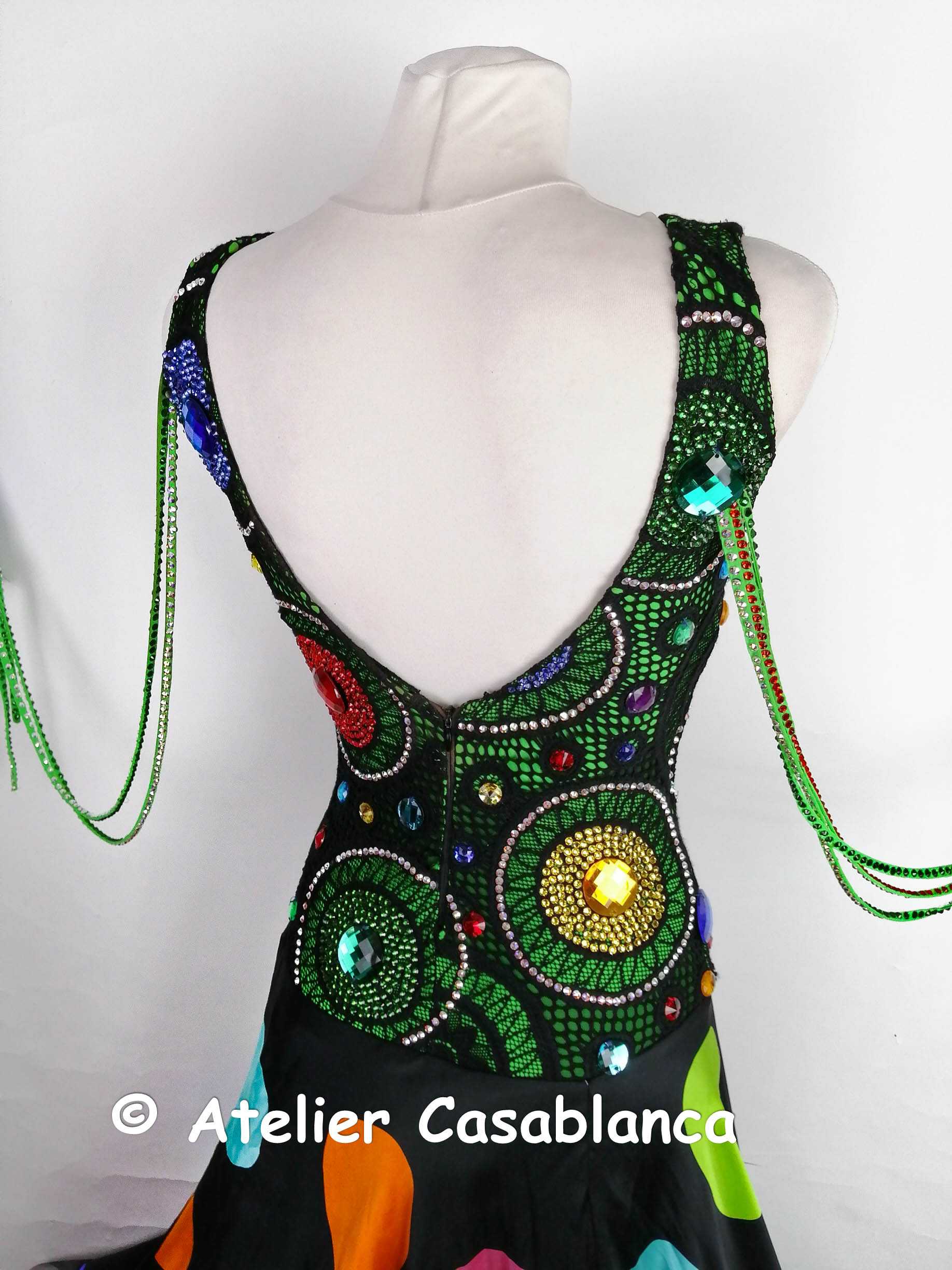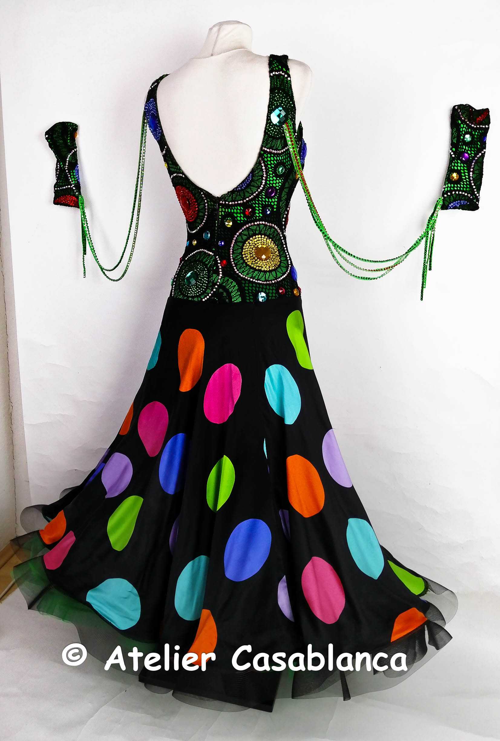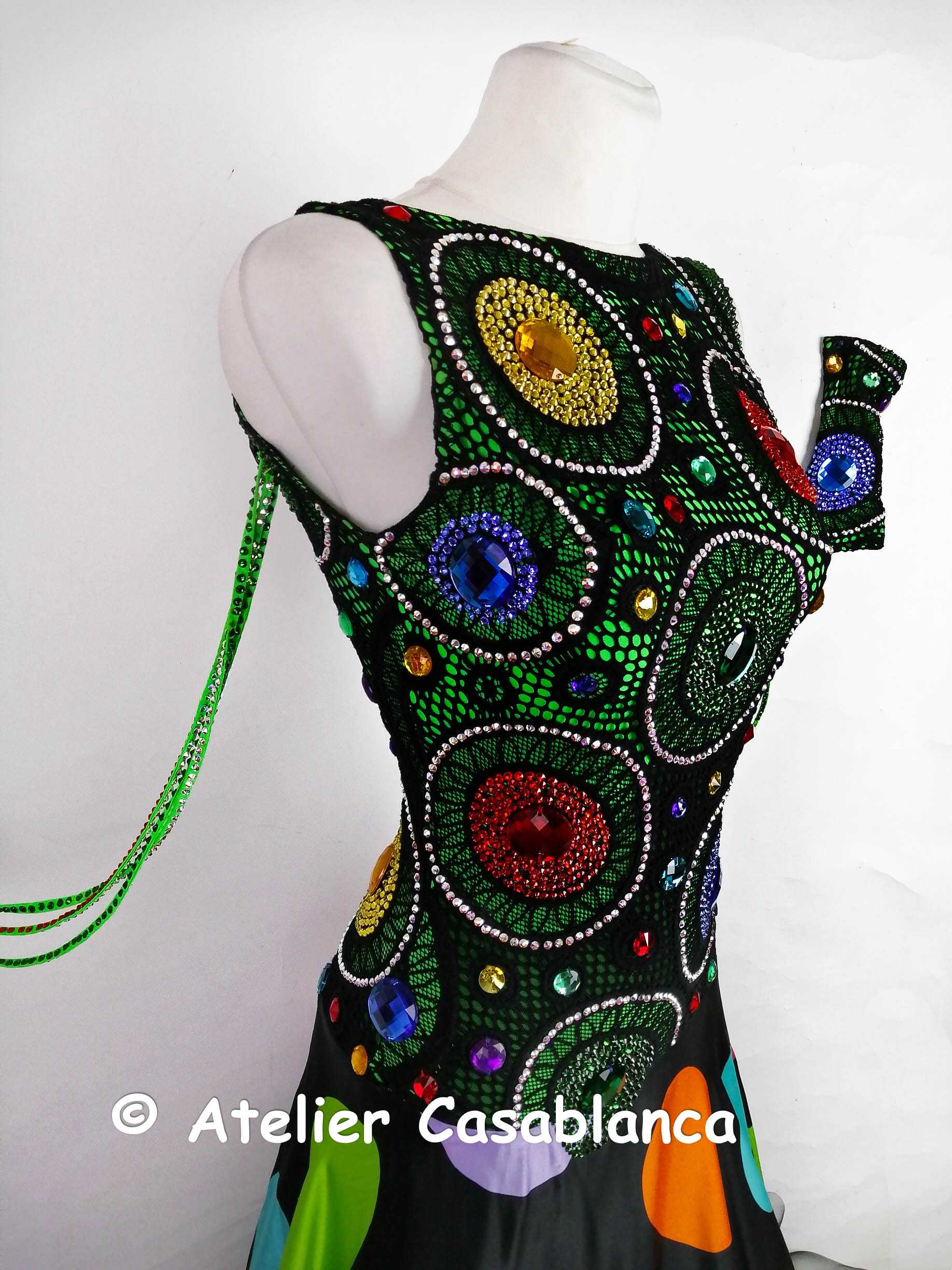 ラトビアの超素晴らしいダンスドレスデザイナー、「ガリーナ・ペトルナ」の制作。エメラルドグリーンのストレッチライクラの上に大変スタイリッシュでカッコいい黒いストレッチレースを重ね、円形の柄が浮き上がるようにイエローや赤、グリーン、ブルーなどのスワロフスキの石をぎっしりと貼って埋め尽くしてボディ部分もポルカドットに見せている非常にカッコイイデザインのドレスです。大きなカラーの丸い石のみはスワロフスキが存在しないため普通のものを使っていますが、貼られている石すべては今では非常に珍しくなってしまったスワロフスキのみを使っています。