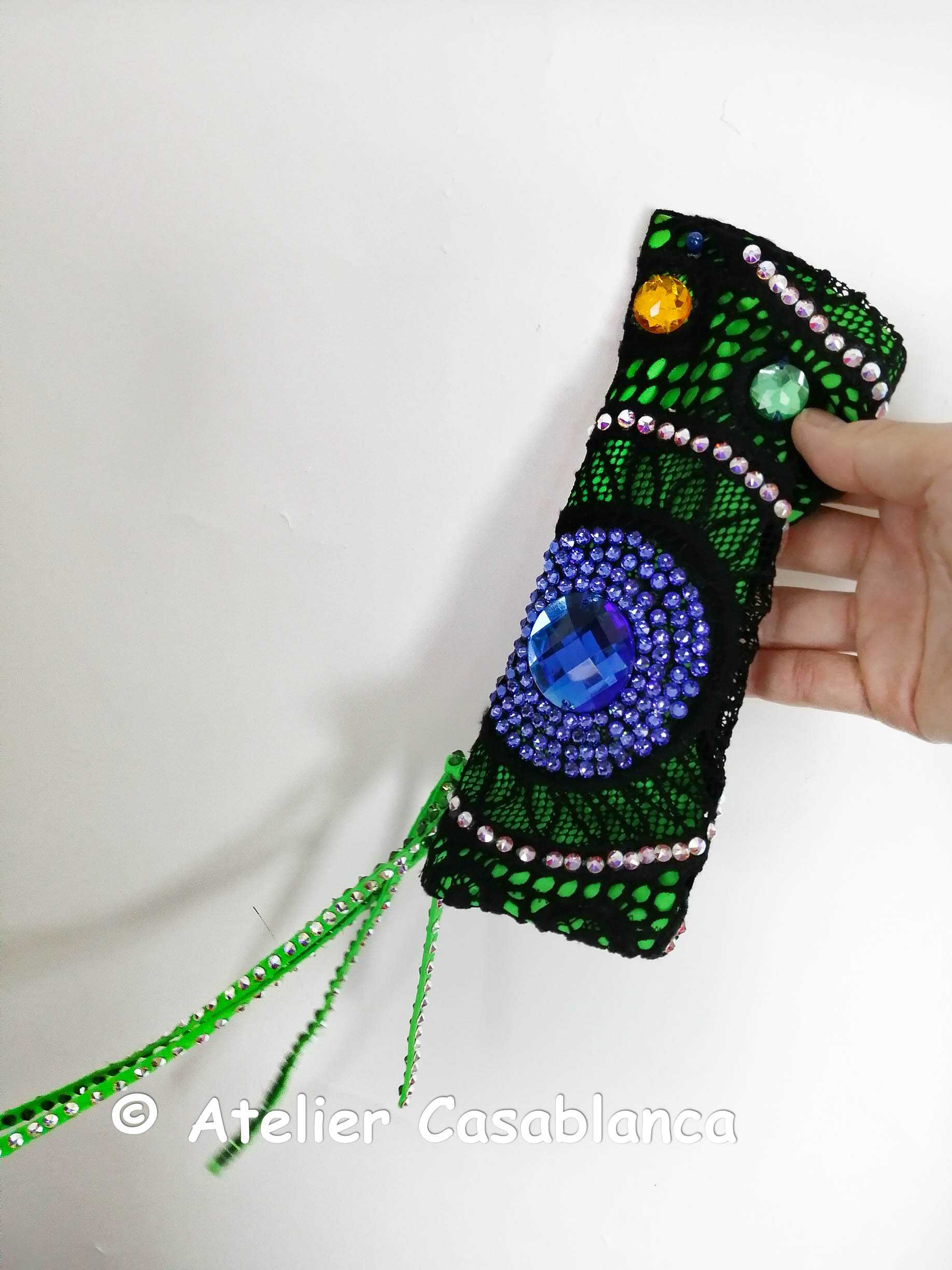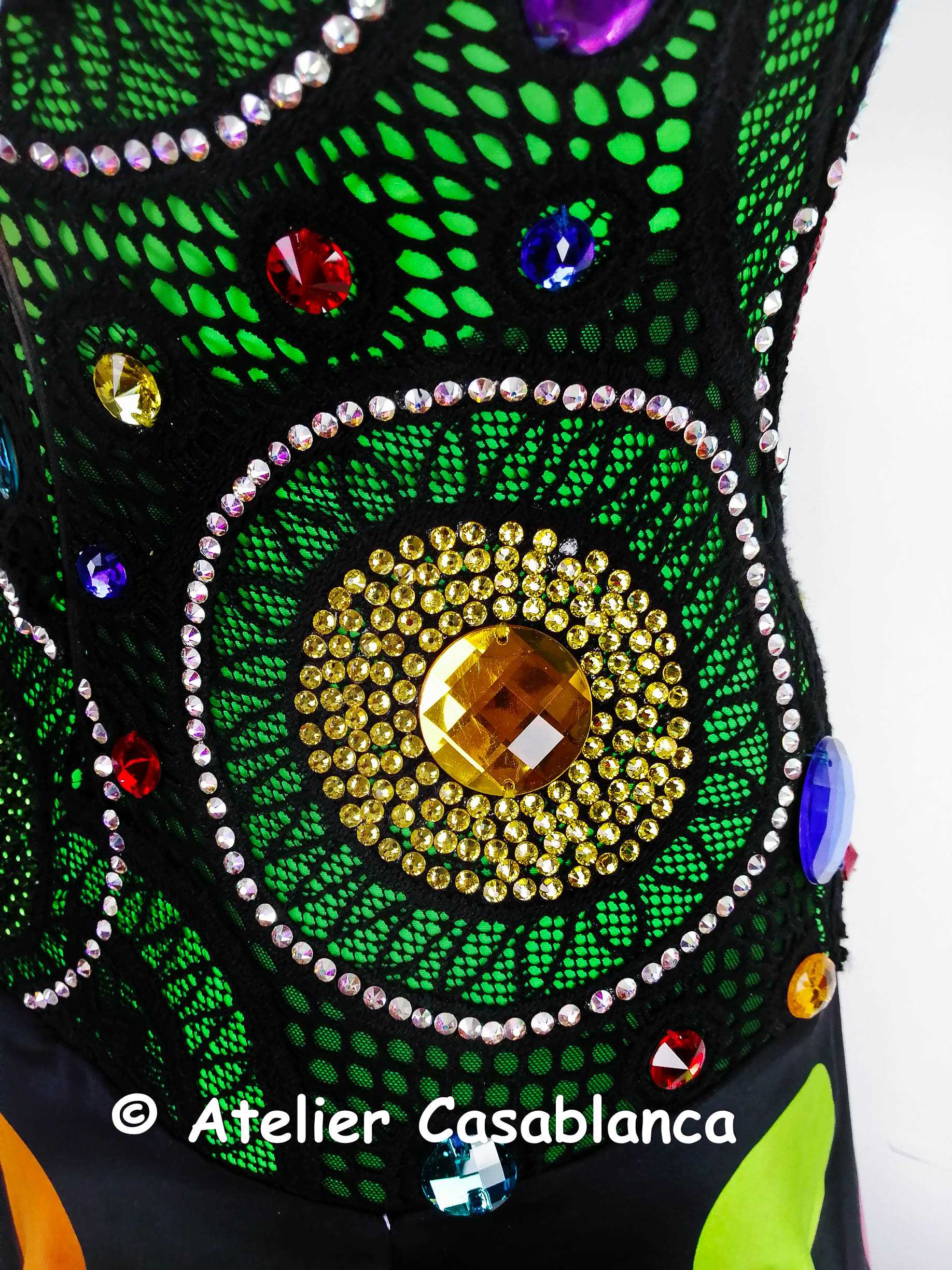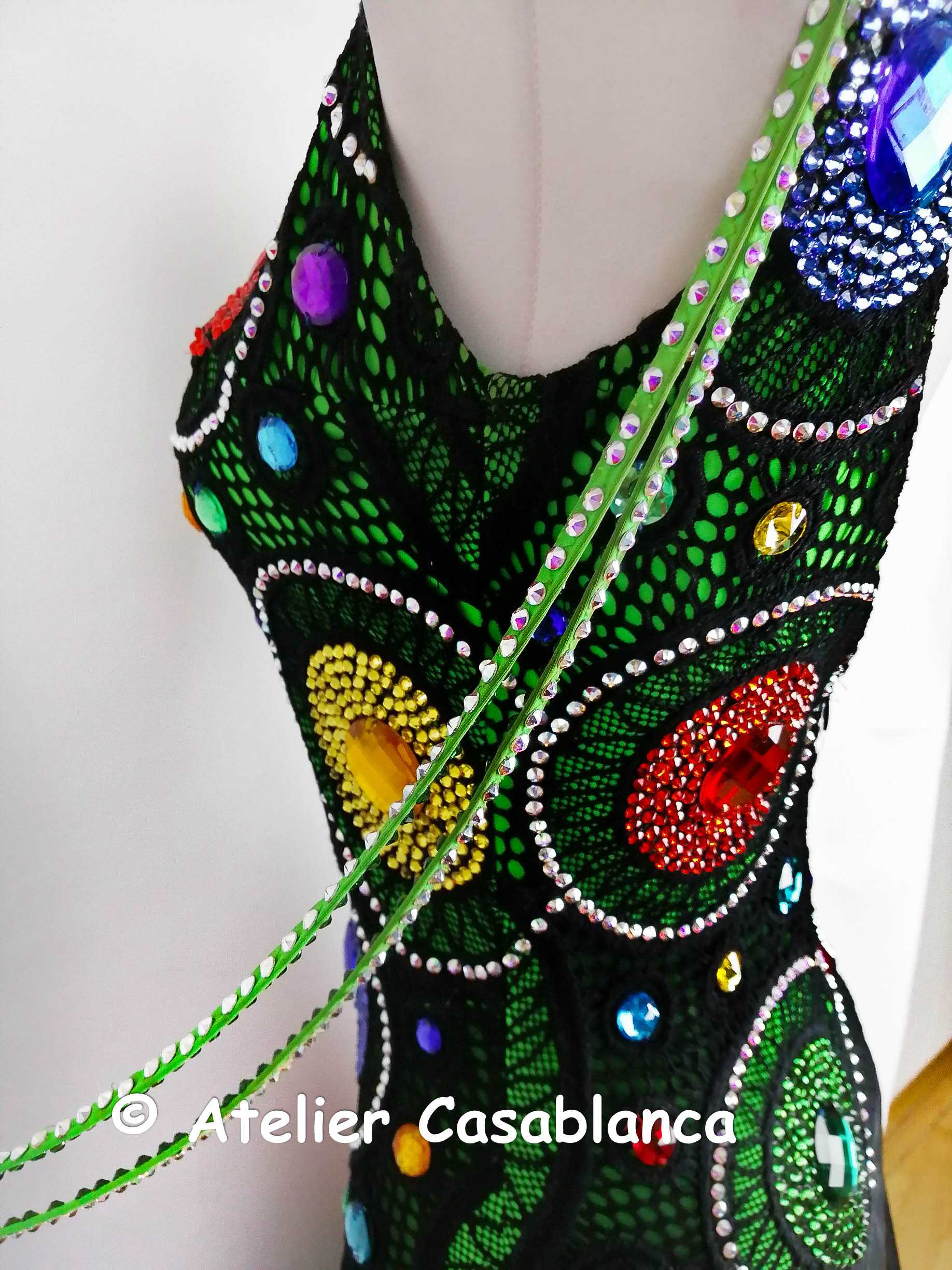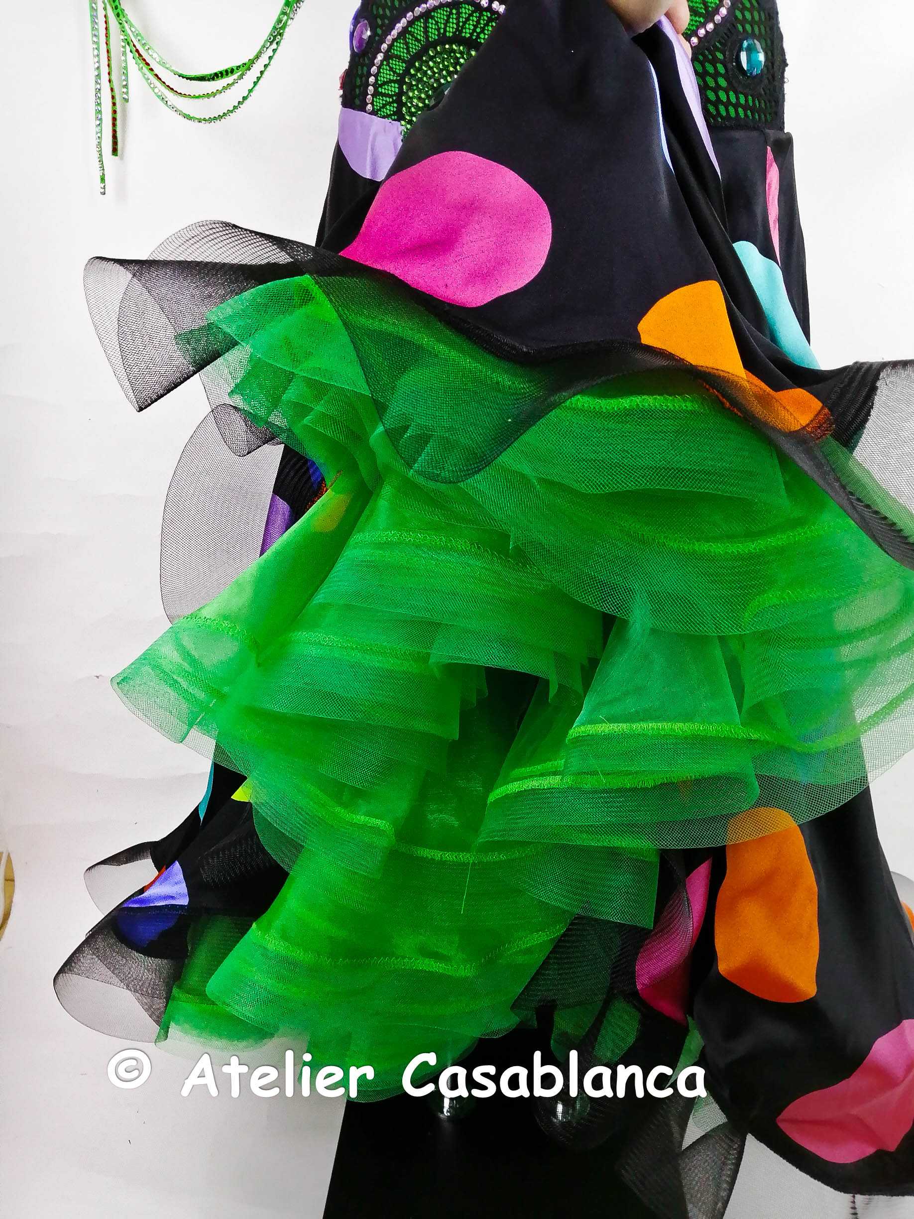 ラトビアの超素晴らしいダンスドレスデザイナー、「ガリーナ・ペトルナ」の制作。エメラルドグリーンのストレッチライクラの上に大変スタイリッシュでカッコいい黒いストレッチレースを重ね、円形の柄が浮き上がるようにイエローや赤、グリーン、ブルーなどのスワロフスキの石をぎっしりと貼って埋め尽くしてボディ部分もポルカドットに見せている非常にカッコイイデザインのドレスです。大きなカラーの丸い石のみはスワロフスキが存在しないため普通のものを使っていますが、貼られている石すべては今では非常に珍しくなってしまったスワロフスキのみを使っています。